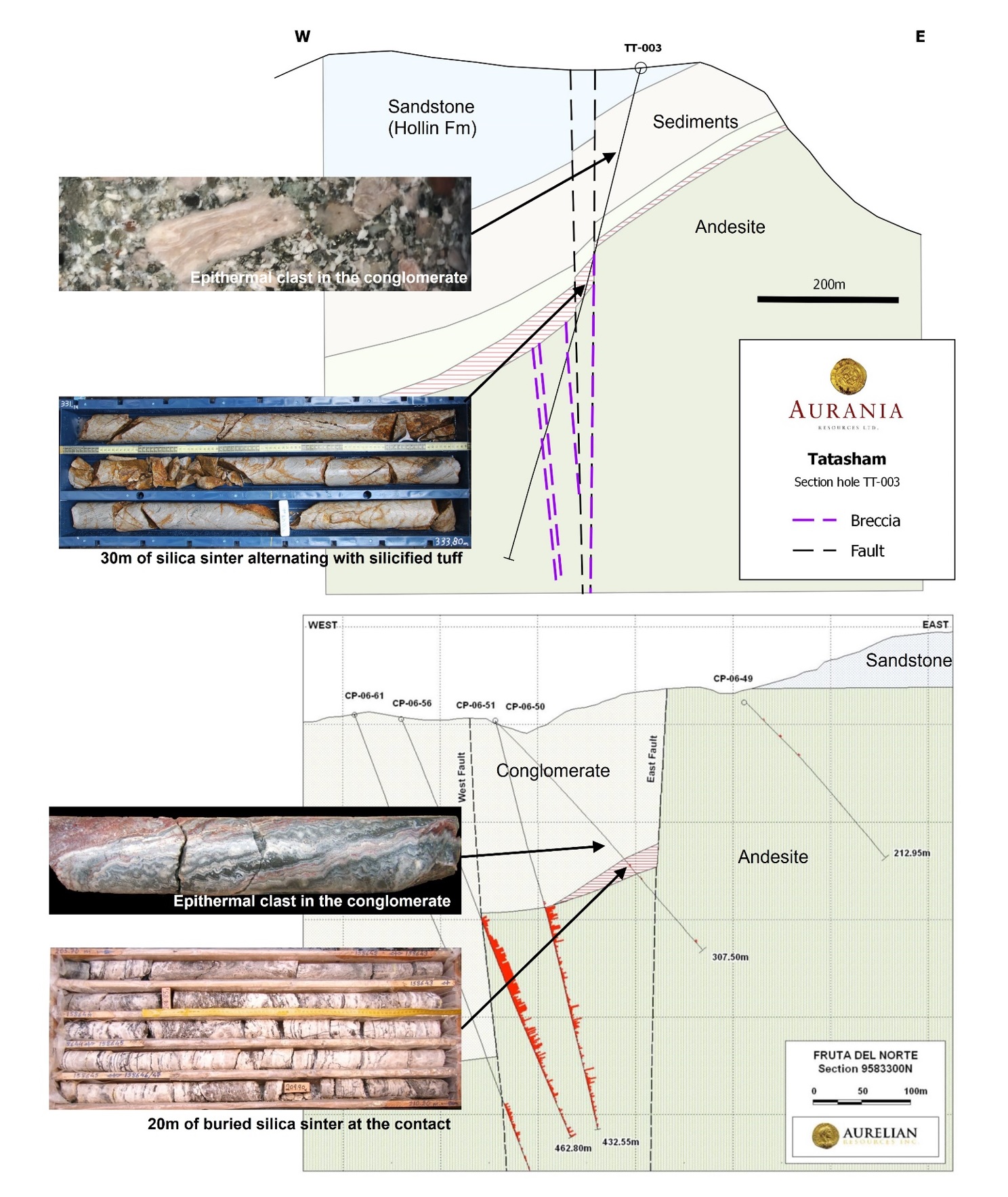 Figura 3: El gráfico superior presenta la sección interpretativa del pozo TT-003 en Tatasham con la ubicación del sinterizado sobre la lava de andesita alterada de la Formación Santiago, comparado en el gráfico inferior con la ubicación del sinterizado en Fruta del Norte (de la presentación PDAC de Aurelian en 2008 ).