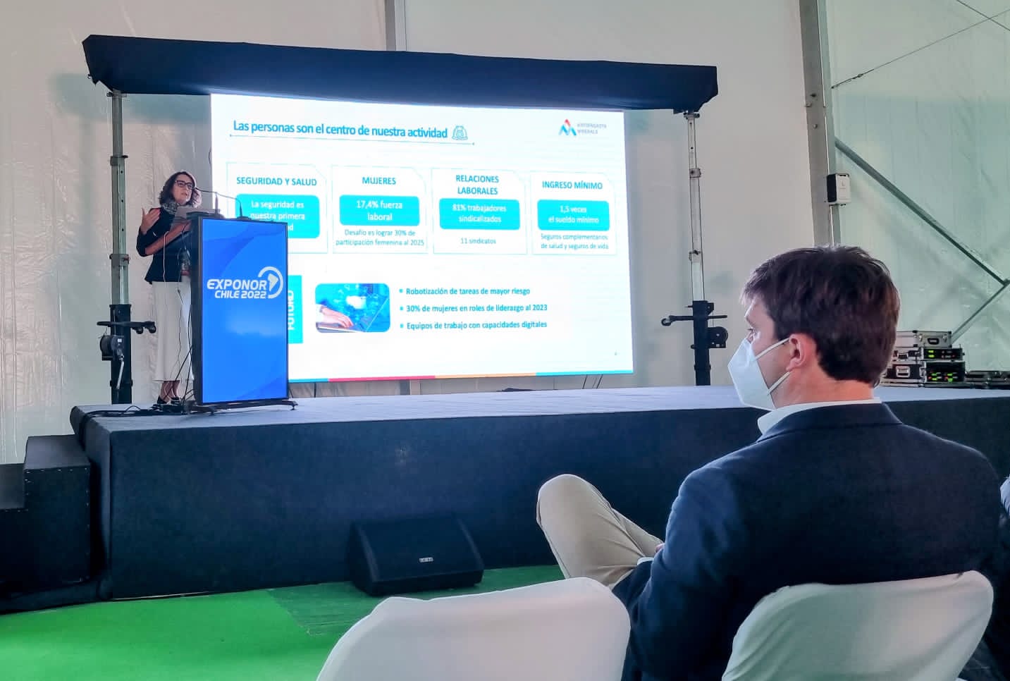 La profesional consignó que en 2021 más de 25.000 personas trabajaron para la compañía y sus proyectos, un 40% de ellos habitantes de las regiones donde opera. Junto con ello, pormenorizó que en 2021 el Grupo Minero disminuyó en un 20% el número de accidentes de alto potencial, promoviendo activamente la vacunación de sus trabajadores contra el COVID-19, la que alcanzó una tasa del 97%. Hoy el 81% de sus trabajadores está sindicalizado, mientras que el 17,4% de la fuerza laboral corresponde a mujeres, porcentaje que a fines de 2022 se estima ascienda a un 20%, acorde a la Estrategia de Diversidad e Inclusión.