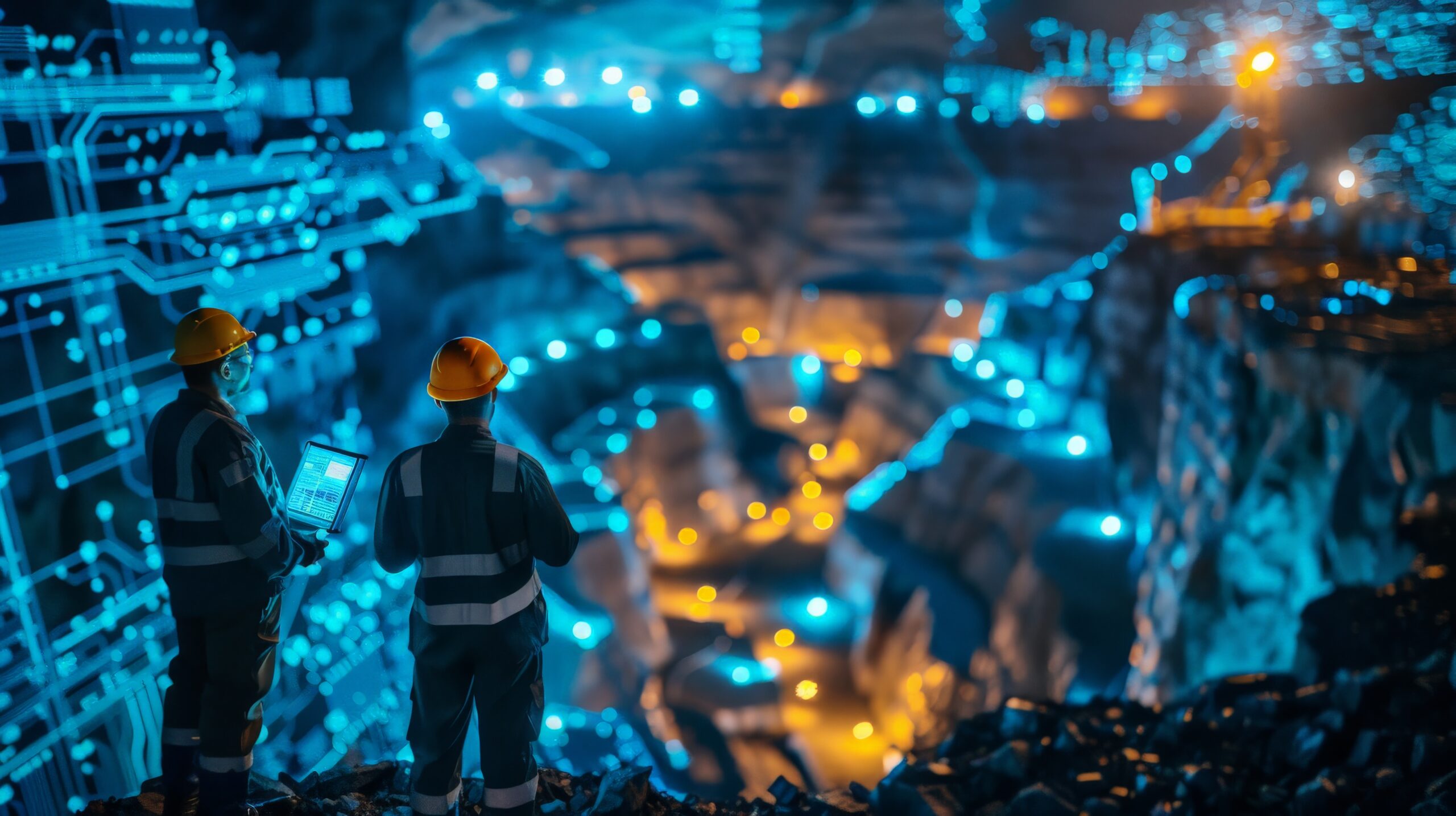 Two engineers in hard hats and safety vests use a digital tablet to monitor a futuristic underground mining operation.