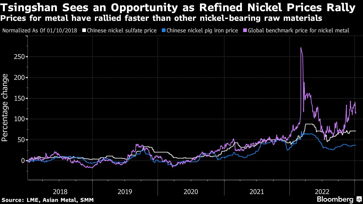 Tsingshan Holding Group Co. de Xiang Guangda busca beneficiarse de una prima inusualmente grande en el precio del níquel refinado, del tipo que se puede entregar en las bolsas de Londres y Shanghái, sobre las formas intermedias que Tsingshan suministra para la fabricación de baterías, según las personas. familiarizado con el asunto.