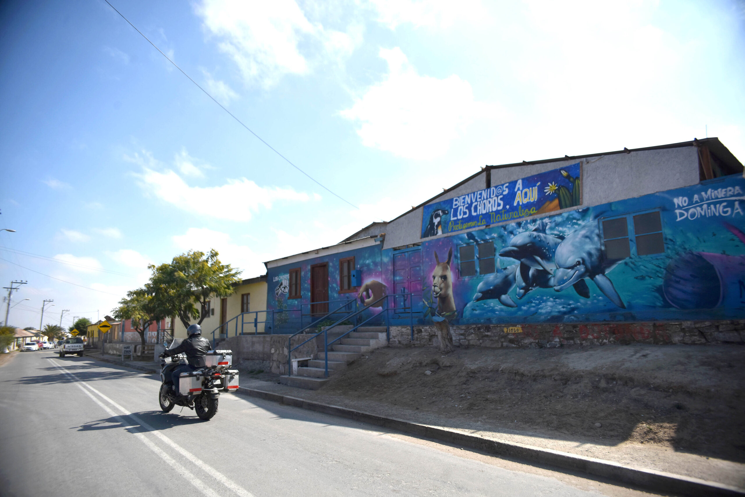 Frente a la plaza del poblado de Los Choros nos encontramos con este mural en el que se representa la fauna local y se visibiliza un rechazo al proyecto Dominga. No obstante, en la localidad también se puede encontrar personas que están a favor de la mina.