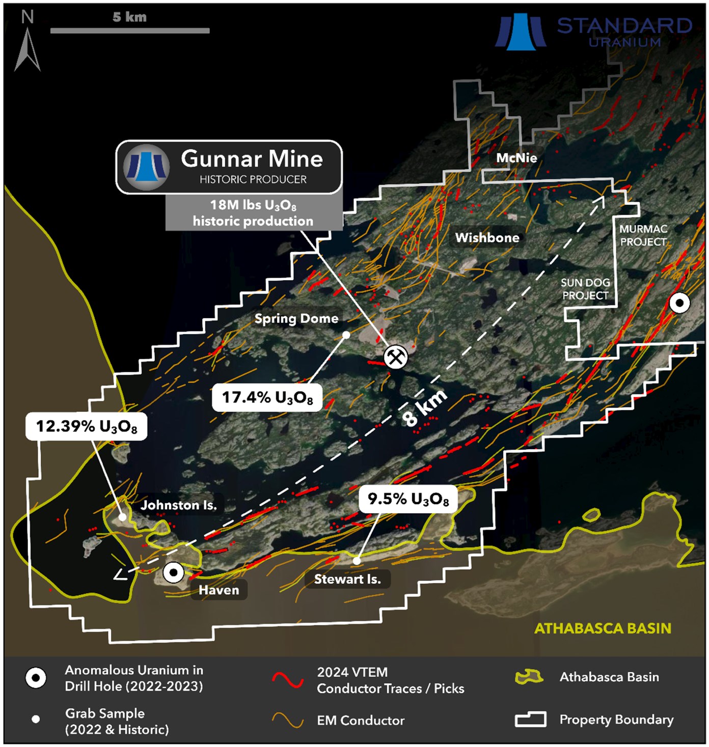 Standard Uranium Ltd. (TSXV: STND) (OTCQB: STTDF) (FSE: 9SU0) («Standard Uranium» o la «Compañía«) se complace en informar los resultados de los ensayos iniciales del programa de exploración 2024 en el Proyecto de Uranio Sun Dog de la Compañía («Sun Dog«) ubicado cerca de Uranium City en el noroeste de Saskatchewan (Figura 1). Se completó el mapeo detallado y la prospección en múltiples áreas objetivo antes del programa de perforación de verano de 2024, devolviendo muestras de afloramiento que contienen uranio anómalo de hasta 13.0% U3O8. El Proyecto se encuentra actualmente bajo un acuerdo de ganancia con Aero Energy Limited (TSXV: AERO) (OTC Pink: AAUGF) (FSE: UU3) («Aero«), que se ha comprometido con el Año 2 del acuerdo de opción de ganancia de tres años (la «Opción«) que se ejecutó el 20 de octubre de 2023. Aero comprometerá un mínimo de 2,0 millones de dólares en gastos de exploración del año 2 en el proyecto a partir del 20 de octubre de 2024. Los programas de exploración son administrados y operados por Standard Uranium.