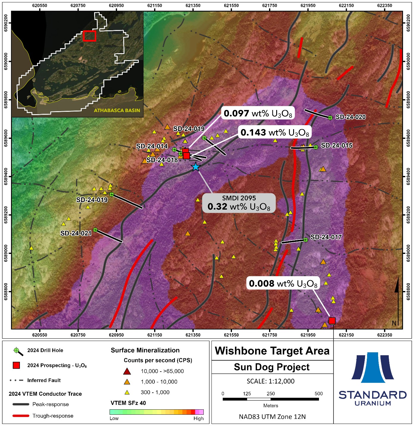 Figura 2. Mapa detallado del área objetivo de Wishbone destacando los pozos de perforación de 2024 y la U de moderada a altamente anómala3O8 Ensayos a partir de la prospección de 2024.