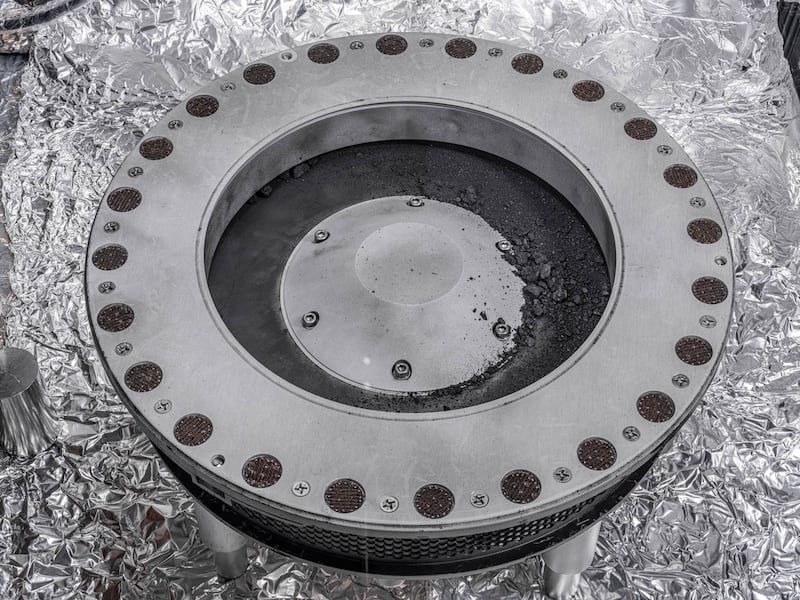 La imagen mostraba un grupo suelto de pequeñas rocas, guijarros y polvo de color carbón que quedaron en la parte exterior del conjunto de recolección de muestras cuando el suelo del asteroide fue succionado a través de un filtro hacia el recipiente de almacenamiento de la nave espacial.