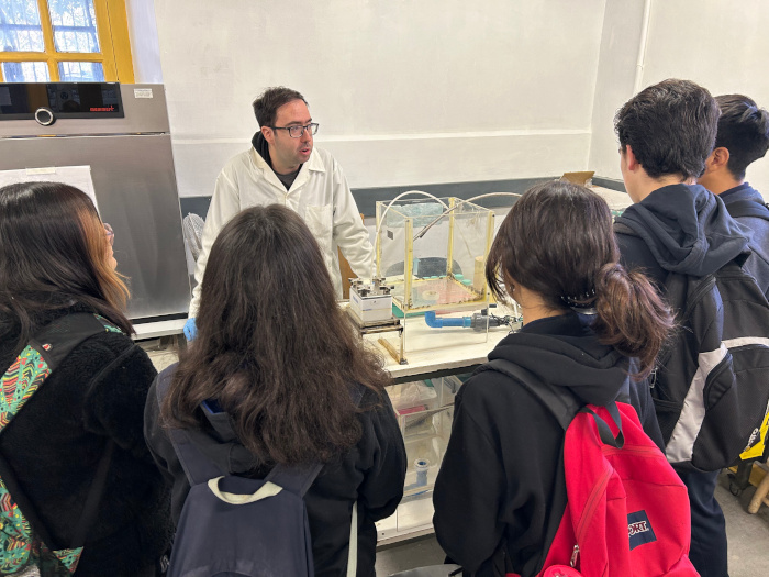 Posteriormente, las y los alumnos visitaron el Laboratorio de Sustentabilidad del AMTC y el DIMin de la Universidad de Chile, en donde fueron recibidos por la investigadora Vania Rojas y los investigadores Rodrigo Quezada y Camilo Zolezzi, del grupo de investigación AMTC sobre agua y sustentabilidad. Allí pudieron conocer sobre el primer prototipo del sistema SolArsenic y presenciaron demostraciones experimentales del trabajo que se realiza en materias de tratamiento y descontaminación de aguas mediante procesos de separación por membranas y uso de nanomateriales desarrollados en el Centro.