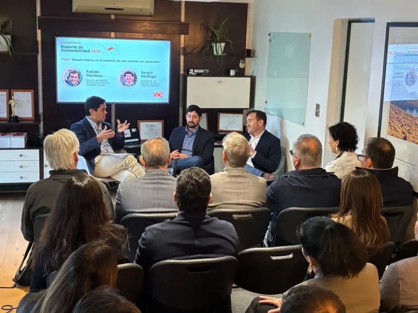 La conversación se desarrolló en el marco del panel “Desafío hídrico en el contexto de una minería más sostenible”, realizado durante el lanzamiento del Reporte de Sostenibilidad 2024, de la empresa de servicios de control y gestión hídrica chilena, We Techs. Participaron Sergio Verdugo, Analista Senior de Minería y Políticas Públicas de la Comisión Chilena del Cobre, (Cochilco); Fabián Martínez, Gerente de Gestión de Recursos Hídricos de Capstone Copper y Jorge Poblete, CEO de We Techs, quien moderó la conversación.