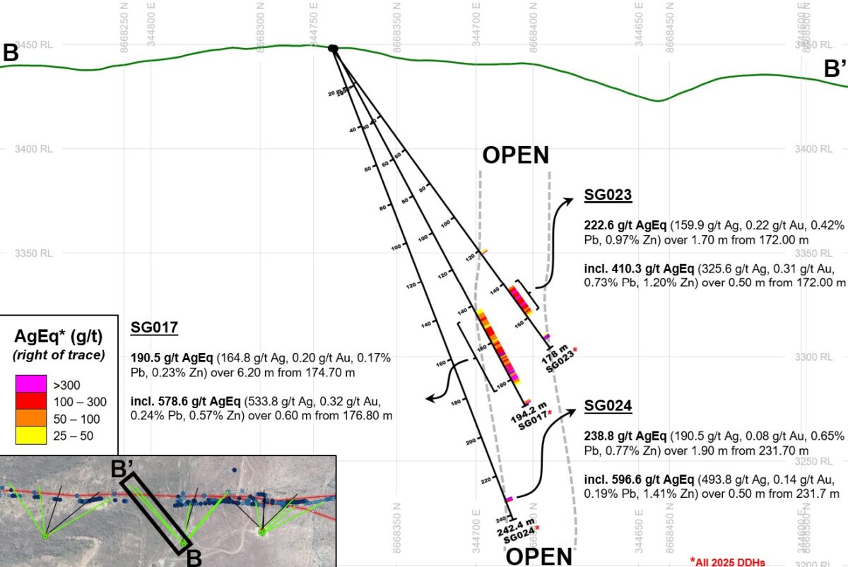 - 121,3 g/t AgEq (107,0 g/t Ag, 0,04 g/t Au, 0,17% Pb, 0,20% Zn) en 2,70 m desde 76,10 m, incl. 239,8 g/t AgEq (214,5 g/t Ag, 0,04 g/t Au, 0,31% Pb, 0,42% Zn) sobre 0,70 m desde 76,90 m, y 226,3 g/t AgEq (210,3 g/t Ag, 0,05 g/t Au, 0,14% Pb, 0,24% Zn) sobre 0,80 m desde 86,80 m.