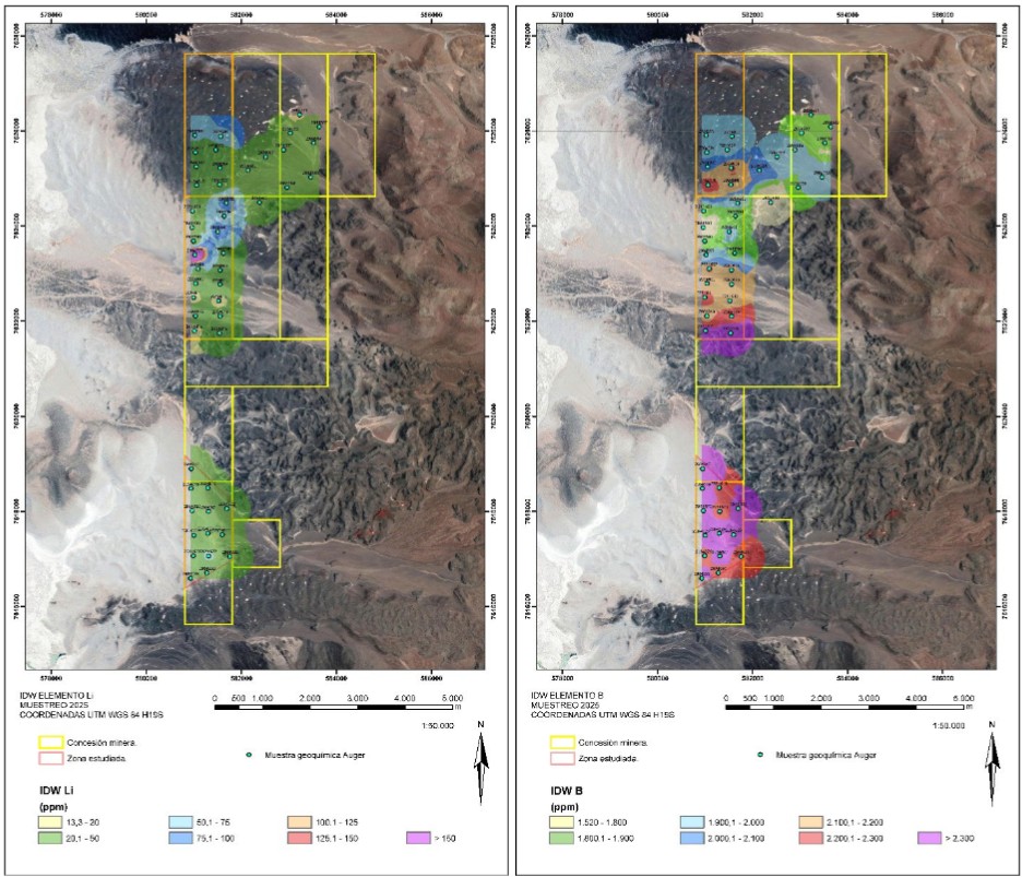 Figura 1. Proyecto Ascotán. Litio (Li) y Boro (B). Resumen y ubicaciones de recolección de muestras de los resultados de la geoquímica de sedimentos cercanos a la superficie.
