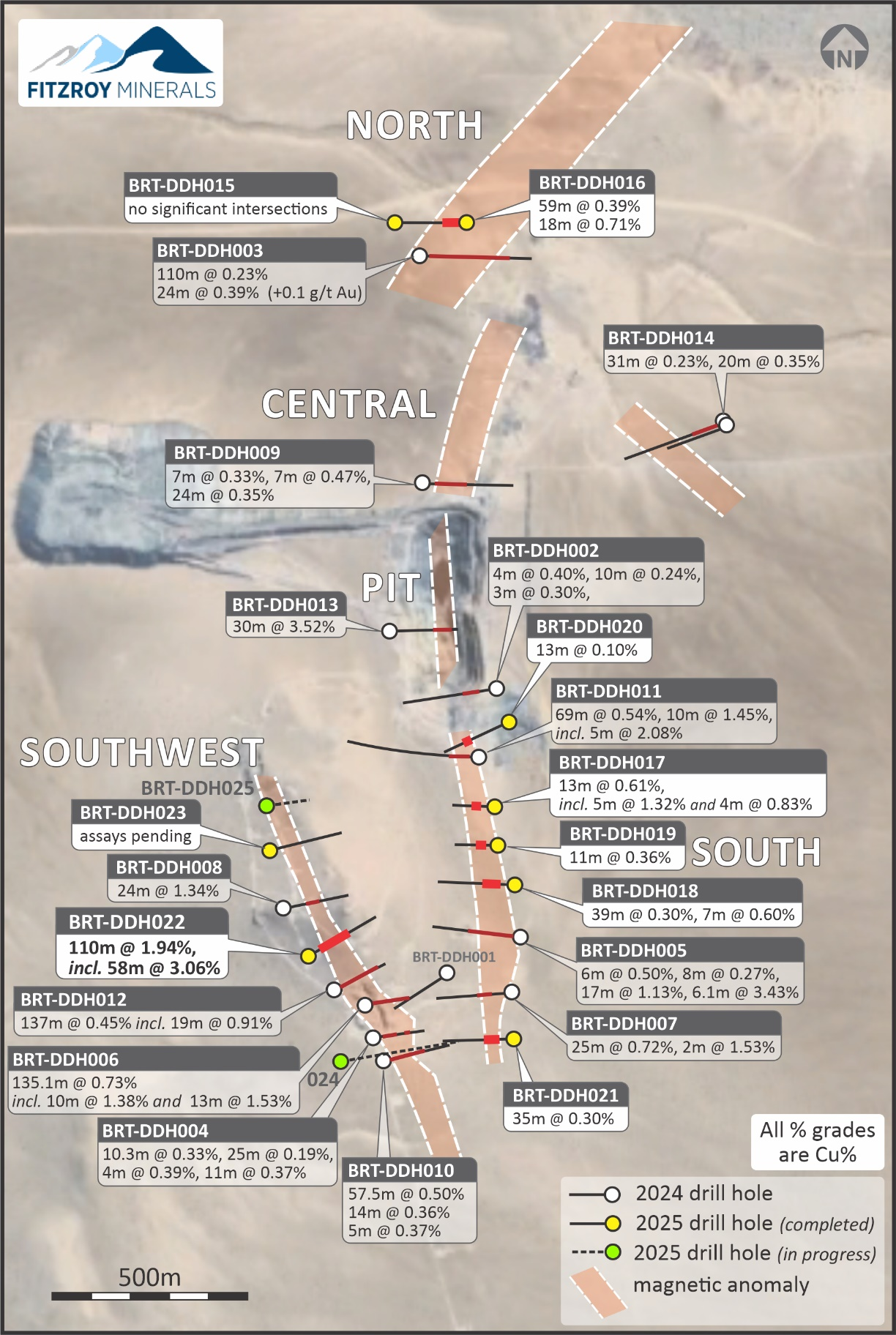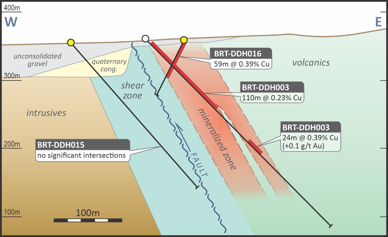 En el Área Norte, el pozo BRT-DDH016, perforado hacia el oeste, interceptó 59 m @ 0.39% Cu de la superficie (collareado en mineralización, bajo una fina capa de grava). Las áreas norte y centro están abiertas en la mayoría de las direcciones: a lo largo del rumbo, en profundidad y hacia el este. Los pozos BRT-DDH017 a BRT-DDH021 se perforaron en el Área Sur e interceptaron mineralización de cobre variable a lo largo de una tendencia norte-sur de 800 m, con interceptos mineralizados que variaron en espesor de 11 a 39 m y leyes que oscilaron entre 0.30% y 0.61% Cu.