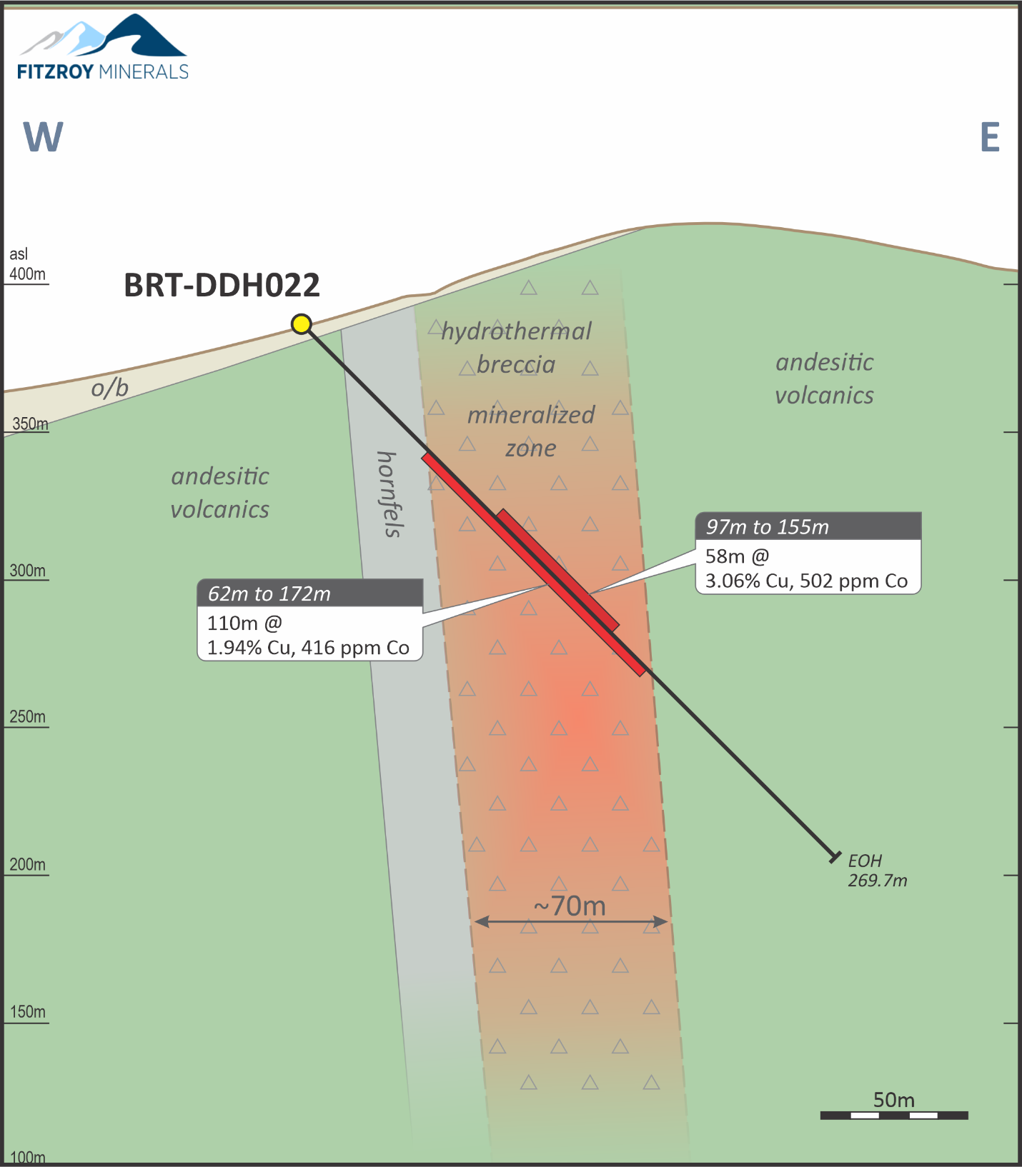 • El pozo BRT-DDH022 interceptó 110 m @ 1.94% Cu y 416 ppm Co desde 62 m, incluyendo 58 m @ 3.06% Cu y 502 ppm Co desde 97 metros.