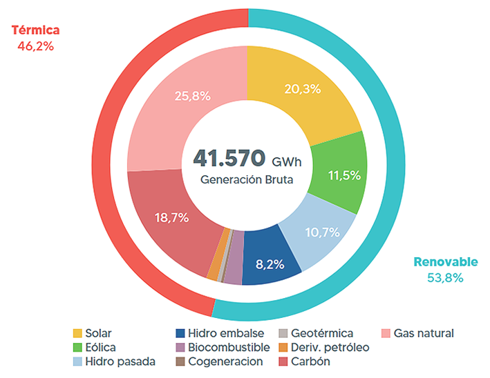 Además, en total, las energías renovables -sin considerar las hidro embalse- representaron el 45,6% del total de la producción de electricidad, casi igualando a las fuentes de energía térmica (46,2%). Mientras que, si se considera a las centrales hidroeléctricas en embalses, la energía renovable pasa a representar el 53,8% de la generación, superando a la térmica por primera vez en 16 años.