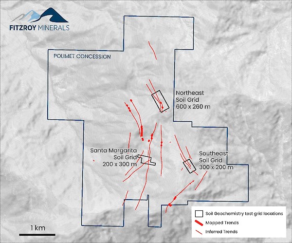 En combinación con la geofísica y la geología, Fitzroy Minerals desarrollará objetivos de perforación durante los próximos meses. El programa geofísico planificado puede incluir una selección de estudios de polarización inducida, análisis espectral y magnetometría. En términos de geología, la atención se centrará en el mapeo estructural detallado. Los resultados combinados del mapeo estructural, la geoquímica del suelo y la geofísica guiarán el programa de perforación en Polimet más adelante este año. Dados los beneficios de infraestructura de Polimet sobre Caballos y el hecho de que Sudamérica está entrando en invierno, ahora se anticipa que el primer programa de perforación de Fitzroy Minerals será en Polimet.