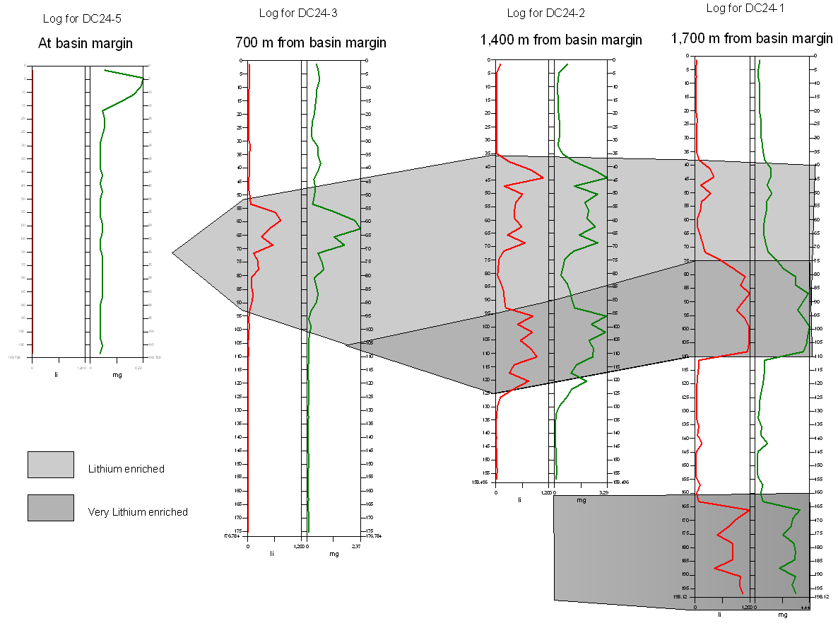 Figura 1. La imagen muestra análisis de litio y magnesio en el fondo del pozo (metros) para los cuatro pozos de perforación completados, distribuidos esquemáticamente desde el margen de la cuenca a la izquierda hacia la cuenca más profunda a la derecha.