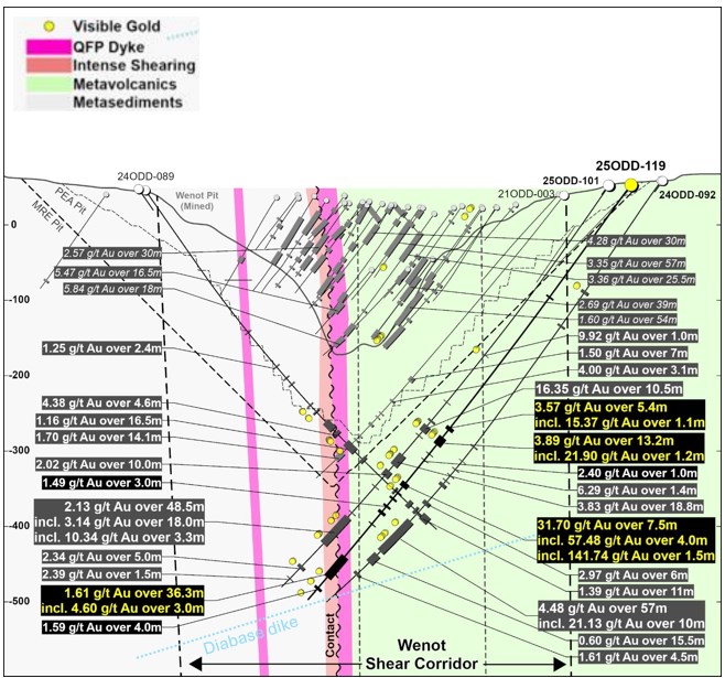 El pozo 25ODD-119 (Figura 2) se perforó desde el lado norte de Wenot aproximadamente a 50 m al oeste de los pozos 24ODD-092 y 25ODD-101, los cuales interceptaron amplias zonas de mineralización de oro de alta ley dentro de la zona históricamente explotada más prolífica conocida como el «Corredor del Dique». Dentro del Corredor del Dique, el Pozo 25ODD-119 interceptó nueve zonas de oro, siendo las mejores 3,57 g/t Au sobre 5,4 m, 3,89 g/t Au sobre 13,2 m (incluyendo 21,9 g/t Au sobre 1,2m) y 31,70 g/t Au sobre 7,5m (que incluye 141,74 g/t Au sobre 1,5m). Estas zonas se cruzaron a una profundidad vertical de aproximadamente 280 m y se extienden a una profundidad de 380 m, sin embargo, los pozos menos profundos más antiguos muestran grados y anchos igualmente impresionantes dentro de este corredor de diques. La correlación y el alcance de estas múltiples zonas de oro se ilustran mejor en la Figura 2. El intervalo de ensayo de 31.7 g / t Au sobre 7.5 m corresponde bien al intervalo de buzamiento ascendente de 50 m de 3.83 g / t Au sobre 18.8 m en el pozo 25ODD-101 y el intervalo de buzamiento descendente de 50 m de 4.48 g / t Au sobre 57.0 m en el pozo 24ODD-092.