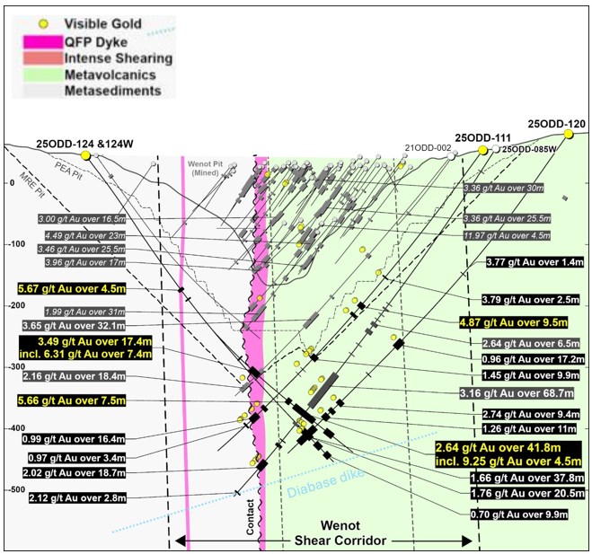 El pozo 25ODD-120 se perforó desde el lado norte de Central Wenot diseñado para probar el corredor del dique a profundidad debajo del pozo 24ODD-085. El pozo no estaba destinado a extenderse a la zona central de QFP que ya se probó a una profundidad de 465 m, donde ensayó 2,02 g / t Au en 18,7 m. En 2024, el pozo -085 interceptó 3,16 g/t Au en 68,7 m, incluidos 6,65 g/t Au en 29,9 m dentro del Corredor del Dique (Comunicado de prensa del 4 de diciembre de 2024). El pozo -120 debía probar 50 m por debajo de esos intervalos. Intersectó al menos 6 intervalos de mineralización de oro dentro del Corredor del Dique y, aunque no se interceptó un intervalo de 68 m, la extensión de buzamiento descendente sí interceptó 2,74 g/t Au en 9,4 m, 9,29 g/t Au en 1,7 m, 1,26 g/t Au en 11,0 m y 1,66 g/t Au en 37,8 m. Estos intervalos representan un acumulado de 59,9 m de mineralización de oro (no continua) dentro del Corredor del Dique, aproximadamente 150 m por debajo de la capa del tajo PEA de 2024. El pozo también interceptó 0,96 g/t Au a lo largo de 17,2 m en el extremo norte del Corredor del Dique, dentro de los volcanes.