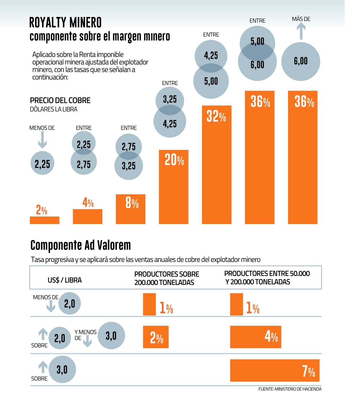 “En la minuta del gobierno se había adelantado que la tasa por el elemento de renta minera sería 32% hasta los US$ 5 por libra de cobre. Sin embargo, añadió una tasa adicional de 36% para valores por sobre US$ 5 por la libra de cobre, para intentar recuperar mayor valor de ese alto precio”, señala Alejandro Montt, abogado socio de Dalgalarrando y Cía, experto en Recursos Naturales.