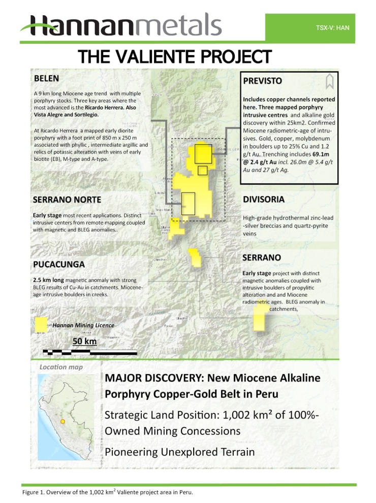 Durante 2021, Hannan apostó y aún mantiene 1.002 km2 de concesiones mineras 100% propias en Valiente que cubren terreno inexplorado para posibles objetivos de pórfido mineralizado en el centro oriental del Perú. El Proyecto Valiente ha evolucionado rápidamente de un prospecto greenfields a una oportunidad de prospectos múltiples.