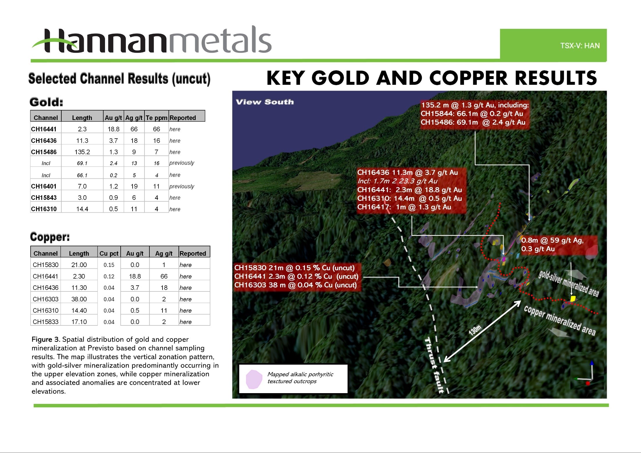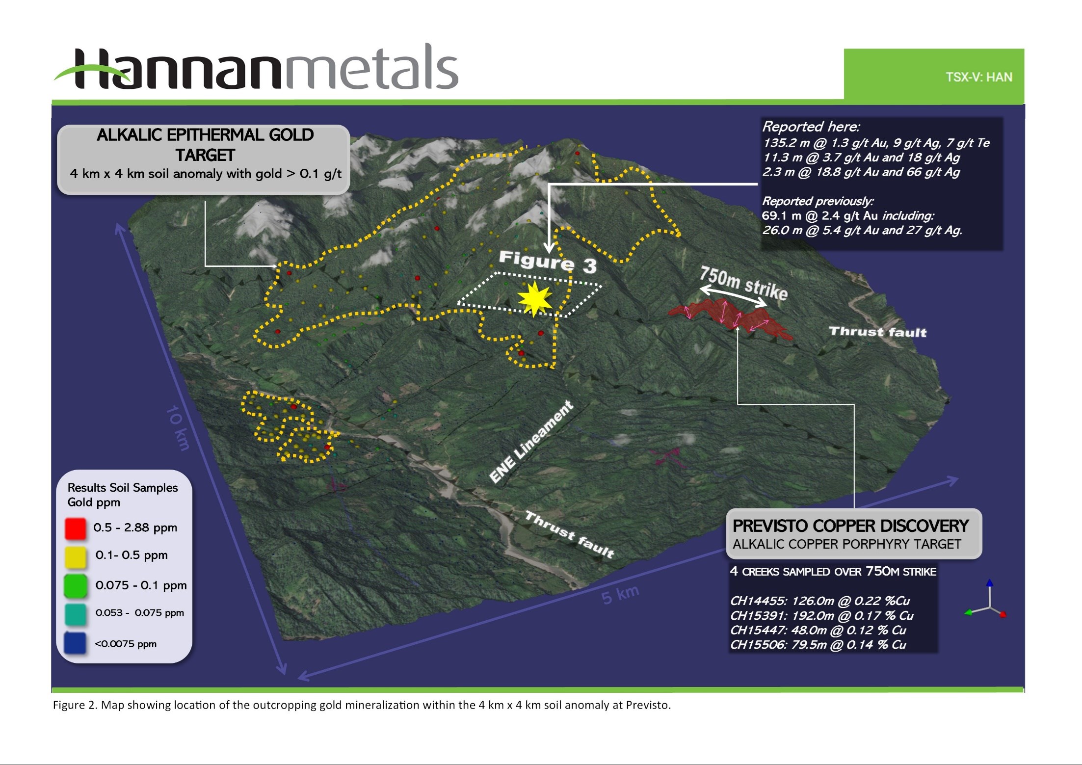 Previsto es un sistema emergente de pórfido epitermal de oro y cobre-oro de tipo alcalino a gran escala. Junto con los canales de oro reportados aquí, Hannan también ha identificado una anomalía de oro en el suelo de 4 km x 4 km que también está asociada con ambos: