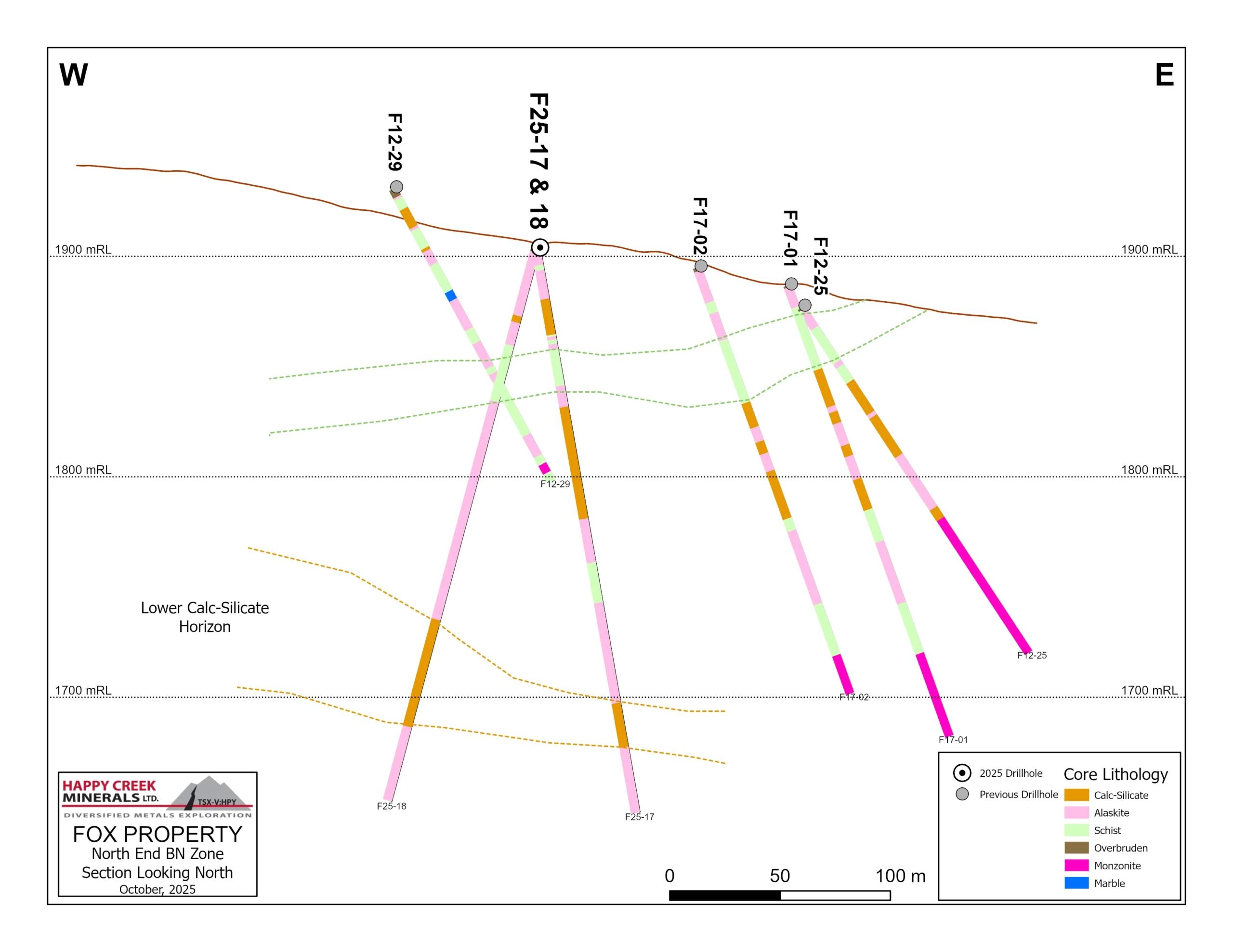 Los pozos F25-16, F25-17 y F25-18 interceptaron múltiples horizontes de silicato de calcio que van desde 60 metros a 120 metros de profundidad, además de un horizonte de silicato de calcio más profundo a aproximadamente 175 a 225 metros de profundidad. Este segundo horizonte de silicato de calcio está aproximadamente a 100 metros por debajo de los horizontes superiores y apoya el modelo de horizontes de silicato de calcio apilados en profundidad.
