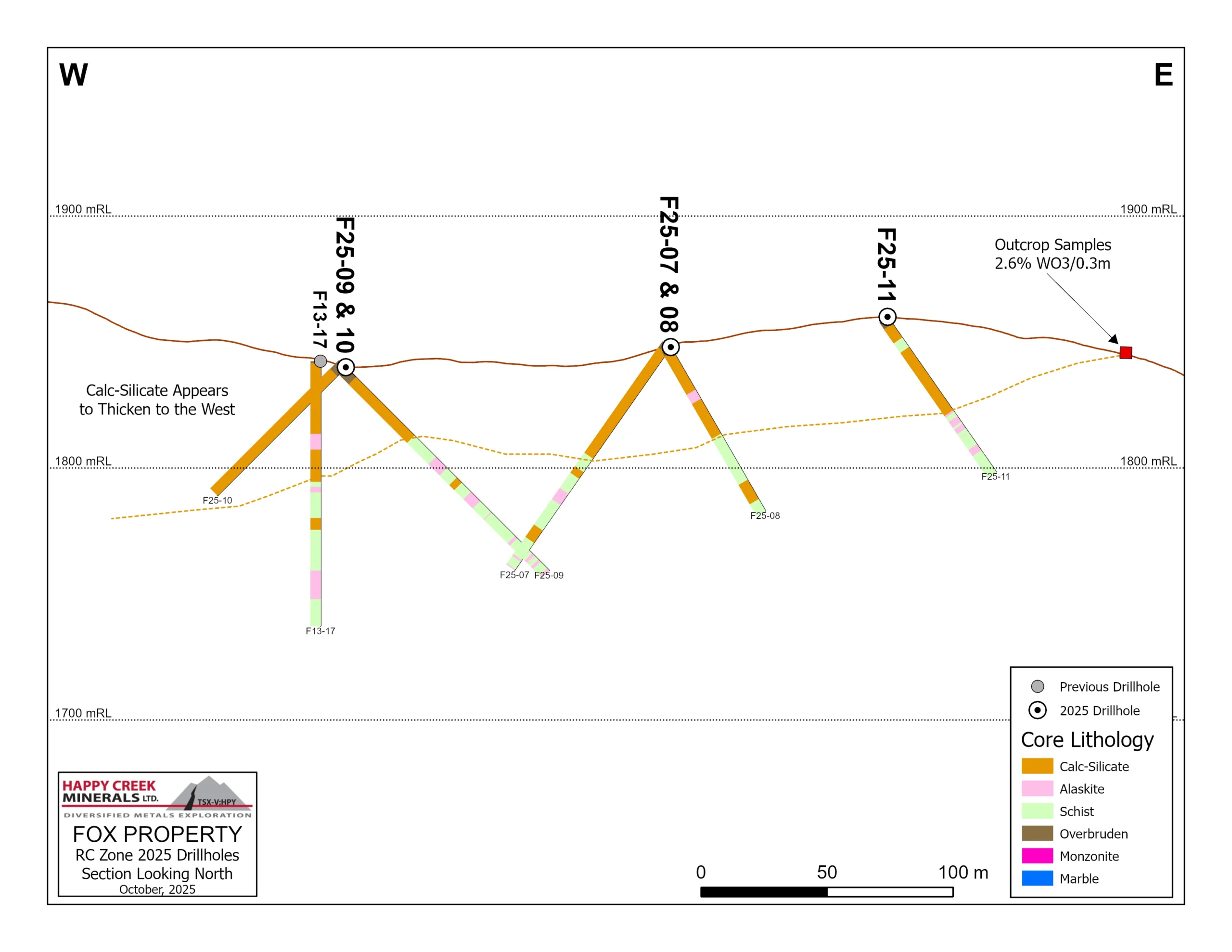 El enfoque en el programa de perforación de 2025 en la zona RC fue explorar la extensión de la mineralización de tungsteno alojada en silicato de calcio principalmente al oeste y al sur y los huecos de relleno en el lado este. La mayoría de los pozos se perforaron hacia el sur, donde casi no se realizaron perforaciones previas y están mucho más allá del límite sur del área de recursos. El trabajo de exploración anterior realizado en esta parte sur es principalmente geología de superficie, muestreo de rocas y excavaciones manuales limitadas en 2025 que arrojaron hasta un 2,6% de WO3 en 0,30 metros. La perforación confirmó la continuidad geológica del silicato de calcio desde la superficie en el este hasta aproximadamente 50 metros de espesor hacia el oeste y lo expandió unos 250 metros hacia el sur desde la zona RC hacia la zona BN. La perforación de 2025 muestra claramente que el horizonte de silicato de calcio continúa hacia el oeste a lo largo de toda la zona RC y está abierto debajo de Deception Mountain.