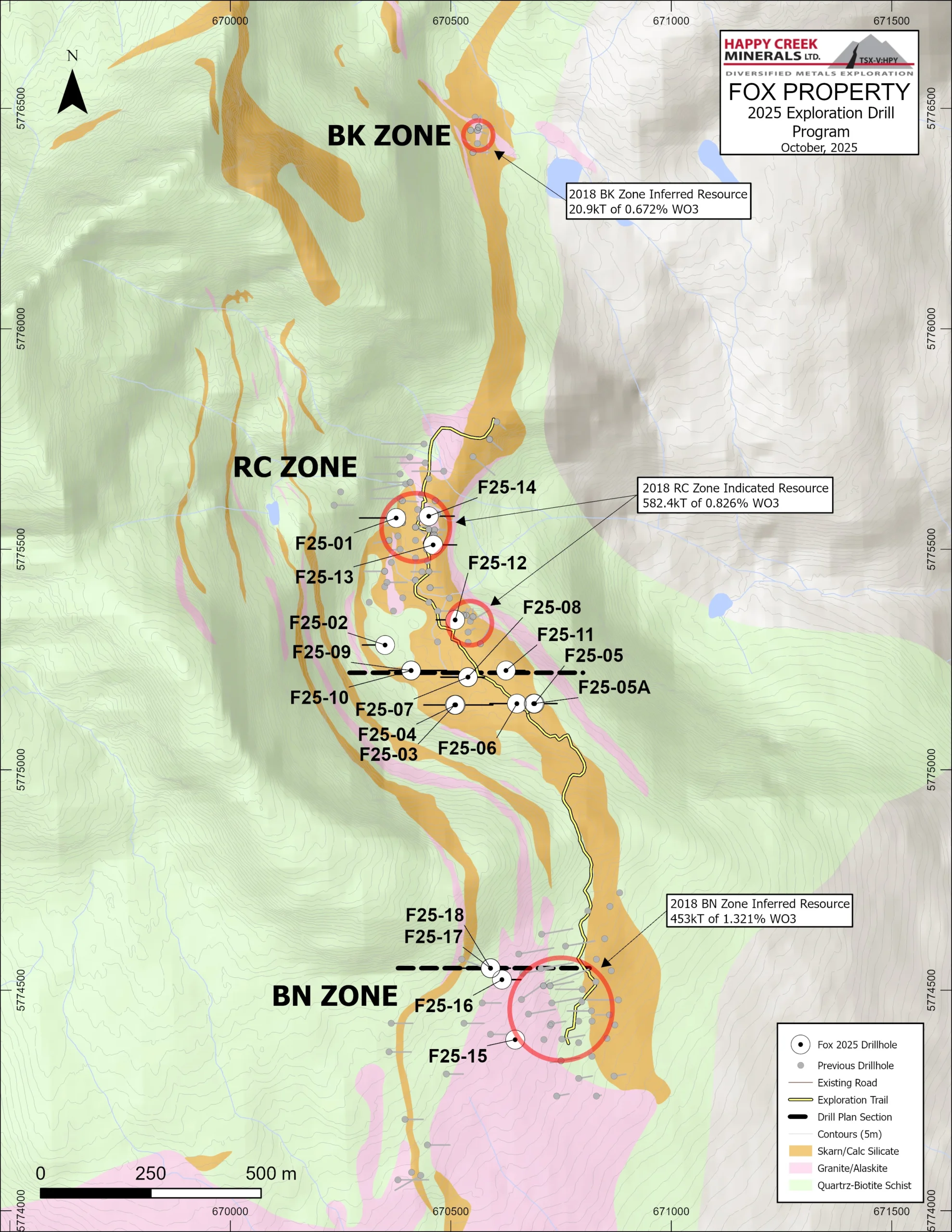 Durante el período comprendido entre el 5 de septiembre y el 5 de octubre de 2025, Happy Creek completó 18 pozos de perforación diamantina de diámetro NQ (un total de 2,175.5 metros) en el Proyecto de tungsteno Fox enfocado en la expansión de recursos en las zonas RC y BN (consulte la Figura 1 y la Tabla 1 para obtener más detalles).