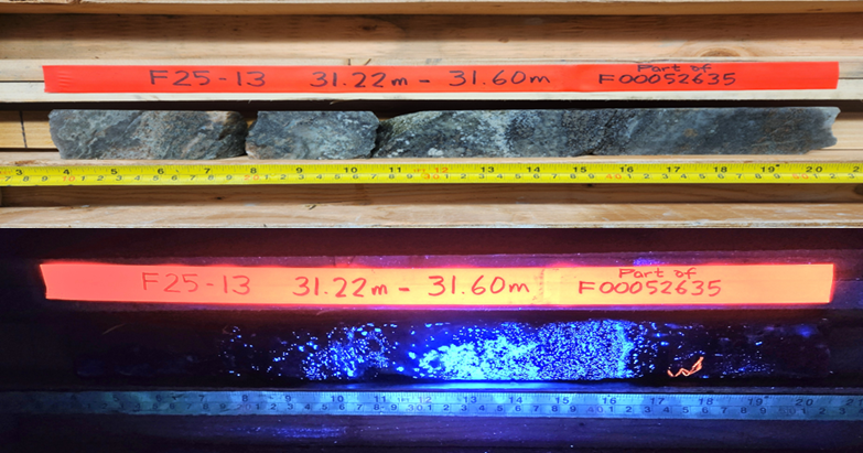 | Foto 1 A/B: Perforación F25 – 13, BN Zone Calc Silicate Horizon a 31 metros de profundidad que muestra el núcleo cortado con y sin iluminación UV que indica la presencia de mineralización de scheelita |