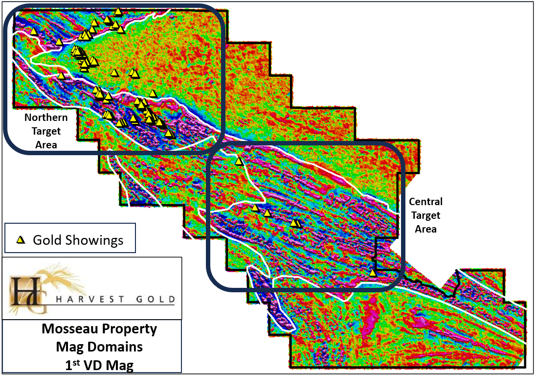 Las tres propiedades de Harvest Gold, Mosseau, Urban-Barry y LaBelle, juntas cubren más de 50 km de rumbo favorable a lo largo de zonas de cizallamiento mineralizado.
