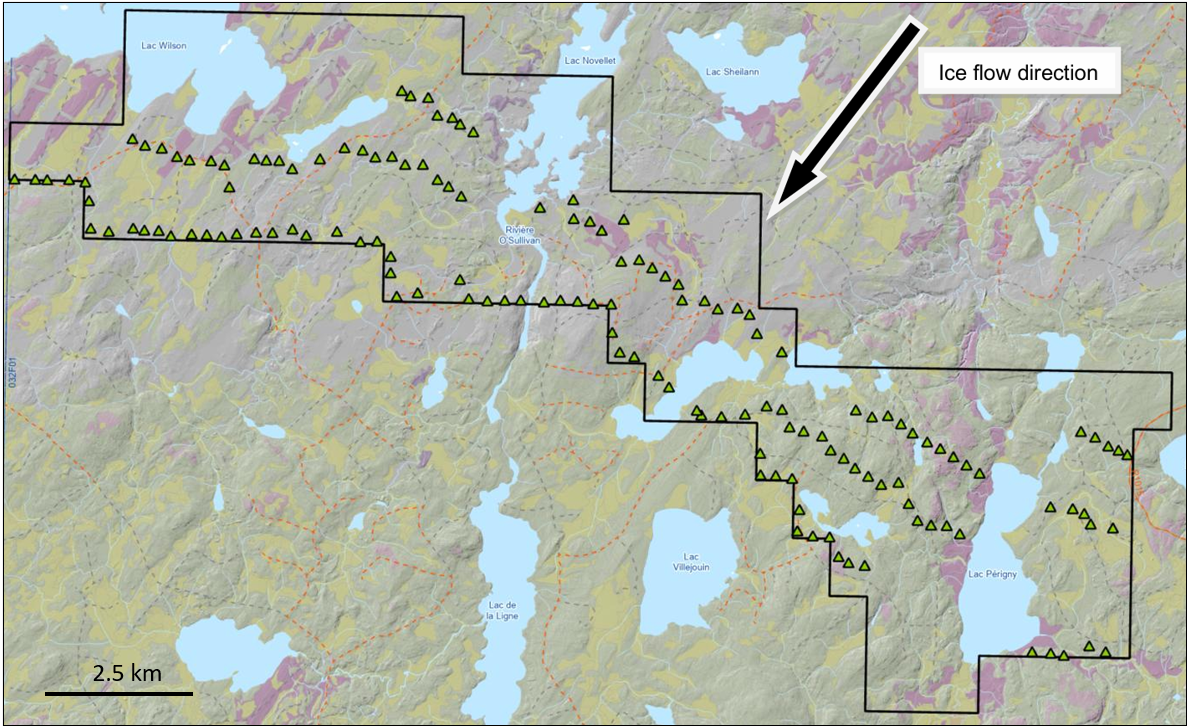 Harvest Gold también ha comenzado el trabajo de campo en su propiedad Urban-Barry de 19 km de largo, que tiene un promedio de 4 km de ancho. El verano pasado se realizaron prospecciones y mapas limitados; sin embargo, debido a una sobrecarga razonablemente extensa, la Compañía determinó que una encuesta de muestreo de labranza sería la herramienta más efectiva para evaluar el potencial de oro de la propiedad. El estudio está siendo realizado por IOS Services Géoscientifiques y consiste en líneas de muestreo orientadas NW-SE espaciadas entre 1.000 y 1.500 metros, perpendiculares a la dirección dominante del flujo de hielo, con muestras individuales recogidas cada 250-300 metros. Se planea un total de 145 muestras (Figura 4).