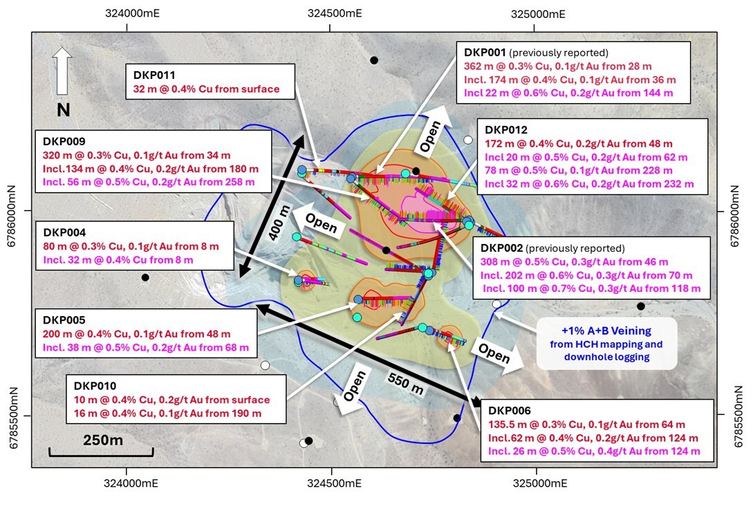 - 308 m con una ley de 0,5% Cu, 0,3 g/t Au desde 46 m hasta el final del pozo (DKP002)