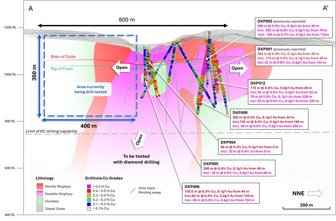 - 200 m con una ley de 0,4% Cu y 0,1 g/t Au desde 48 m hasta el final del pozo (DKP005)