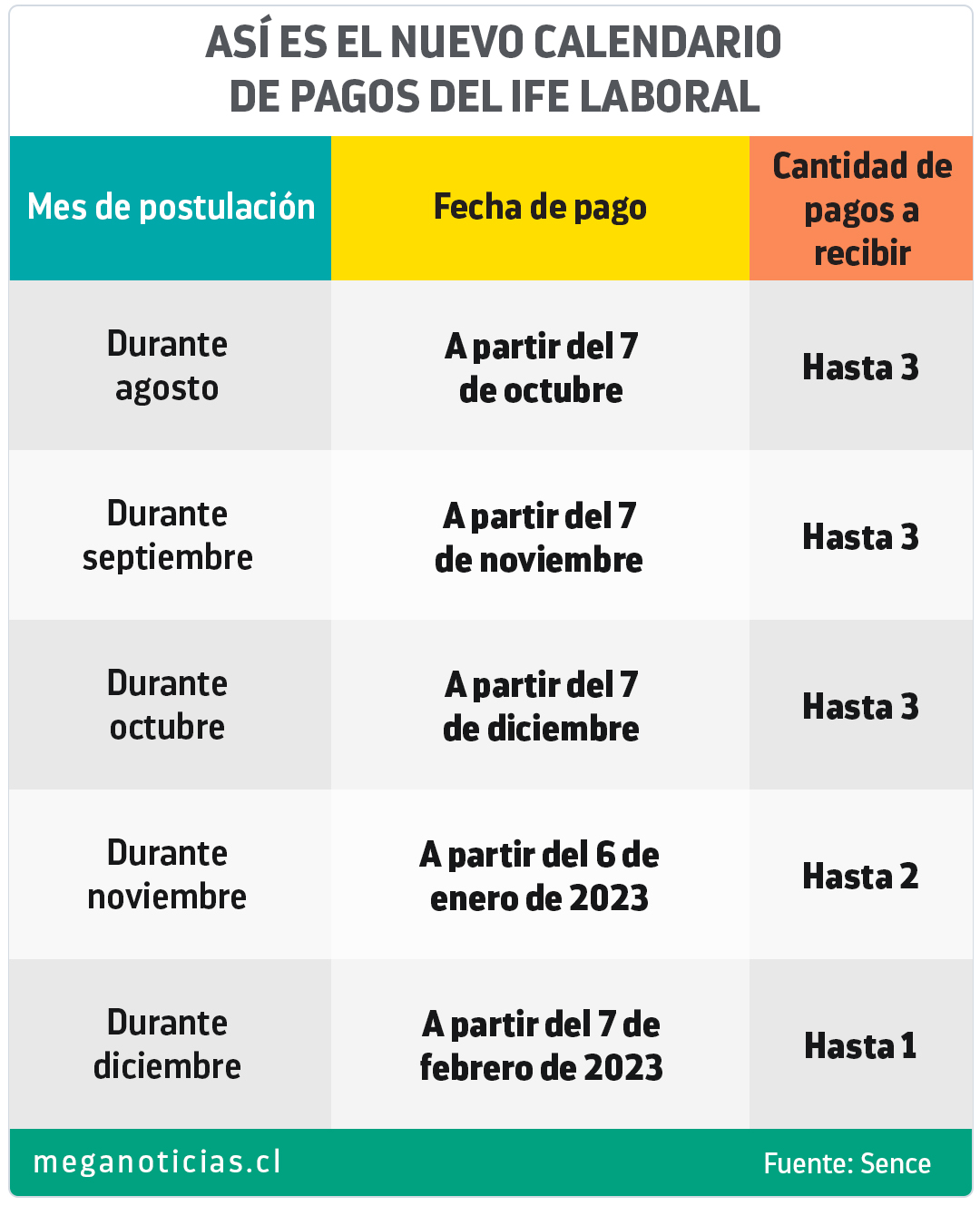 Según informa el Servicio Nacional de Capacitación y Empleo (Sence), organismo encargado de verificar el cumplimiento de las condiciones del beneficio, el próximo pago del IFE Laboral está calendarizado a partir del viernes 7 de octubre.