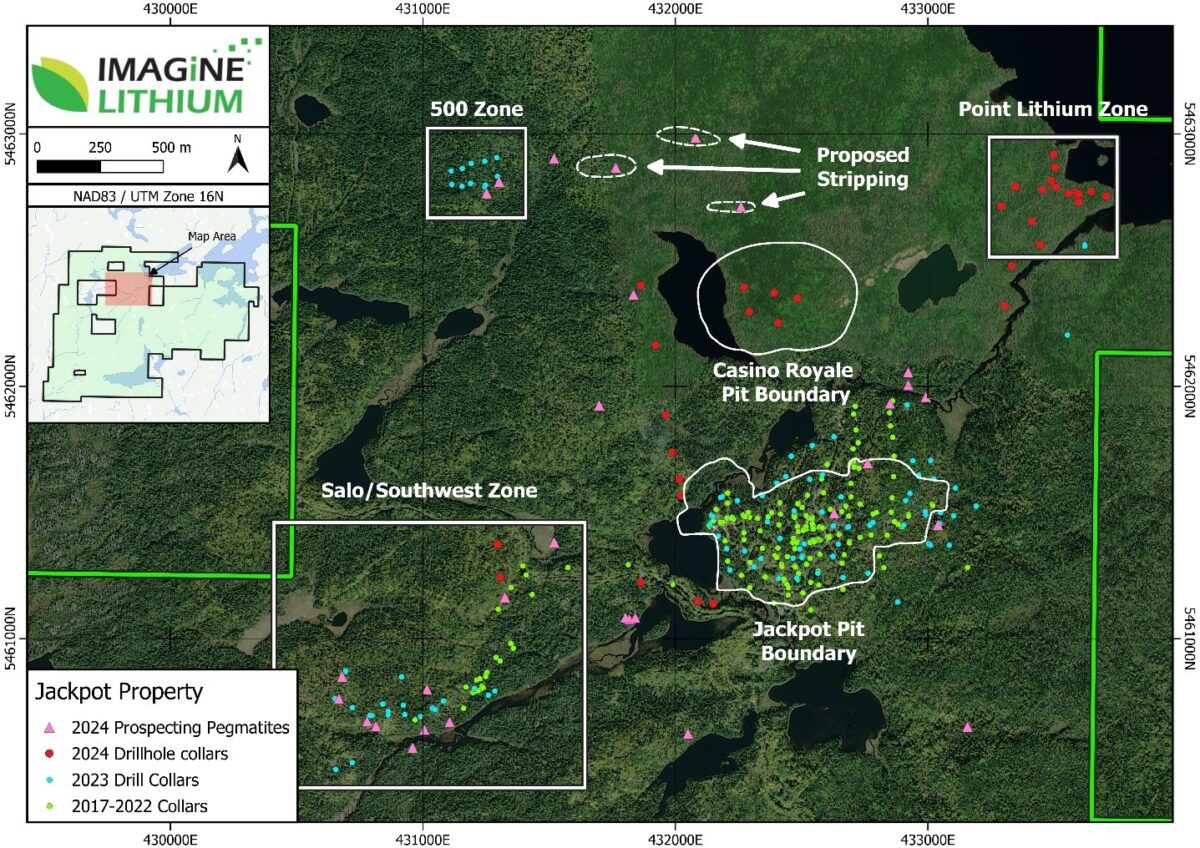 Imagine es una empresa junior de exploración minera enfocada en buscar y adquirir proyectos minerales de clase mundial. La compañía posee la propiedad de litio Jackpot ubicada en el área del lago Georgia, a unos 140 km al NNE de Thunder Bay, Ontario, está aproximadamente a 12 km por carretera de la autopista Trans-Canada (Hwy 11) y está cerca de fuentes de energía, ferrocarriles y puertos. La propiedad de Jackpot consta de 297 reclamos minerales que cubren 18,800 hectáreas. La propiedad contiene recursos minerales que cumplen con NI 43-101 de 3.1 Mt con una ley de 0.85% de Li2O en la categoría Indicada y 5,3 Mt con una ley de 0,91% Li2O en la categoría Inferida, así como una serie de otras muestras de pegmatita conocidas.