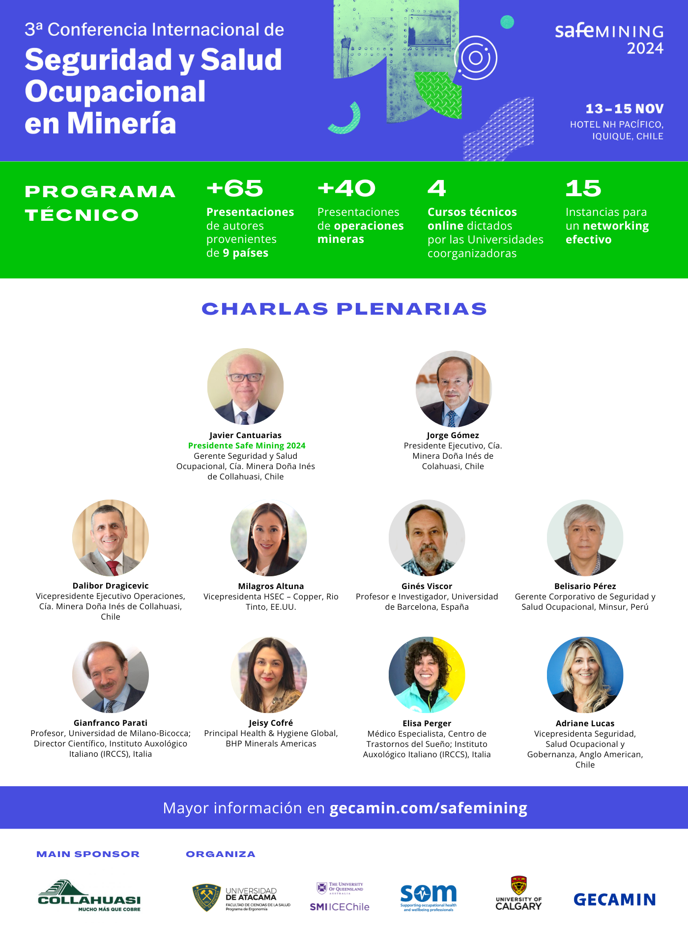 Cabe destacar que la Conferencia Safe Mining entrega un espacio para conversar, debatir y conocer los últimos desarrollos e innovaciones en torno a la seguridad y salud ocupacional en minería. En esta nueva versión, se abordarán materias como la automatización y su impacto en procesos de seguridad; enfermedades laborales y crónicas; fatiga, ergonomía y factores psicosociales en el trabajo; bienestar y factor humano como claves en la cultura organizacional; organización y estrategias para la seguridad y salud ocupacional; salud mental y su impacto en la seguridad; prevención y control de emergencias; entre otras.