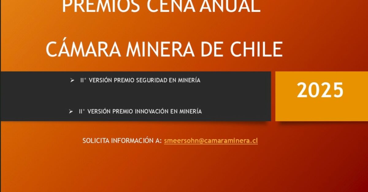 La Cámara Minera de Chile tiene el agrado de anunciar la apertura de postulaciones para los Premios de Seguridad e Innovación en Minería 2025, que se entregarán en el marco de la Cena anual “espíritu de la minería 2025”, que se realizará el 10 de diciembre en el Club 50, es una oportunidad para reconocer y premiar a las empresas que se destacan por su compromiso con la seguridad y la innovación en el desarrollo de la industria minera chilena.