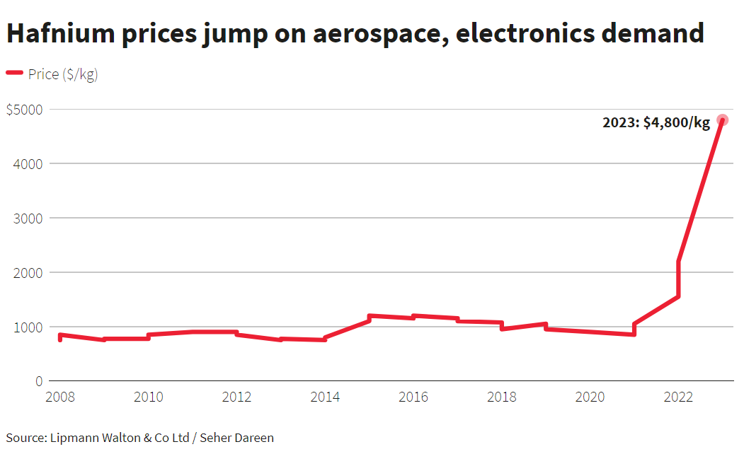 La escasez creada por la sólida demanda de las industrias aeroespacial y electrónica a medida que el crecimiento se aceleró después del levantamiento de las restricciones de Covid ha impulsado un aumento del 400% en los precios del hafnio, llevándolos a niveles récord.