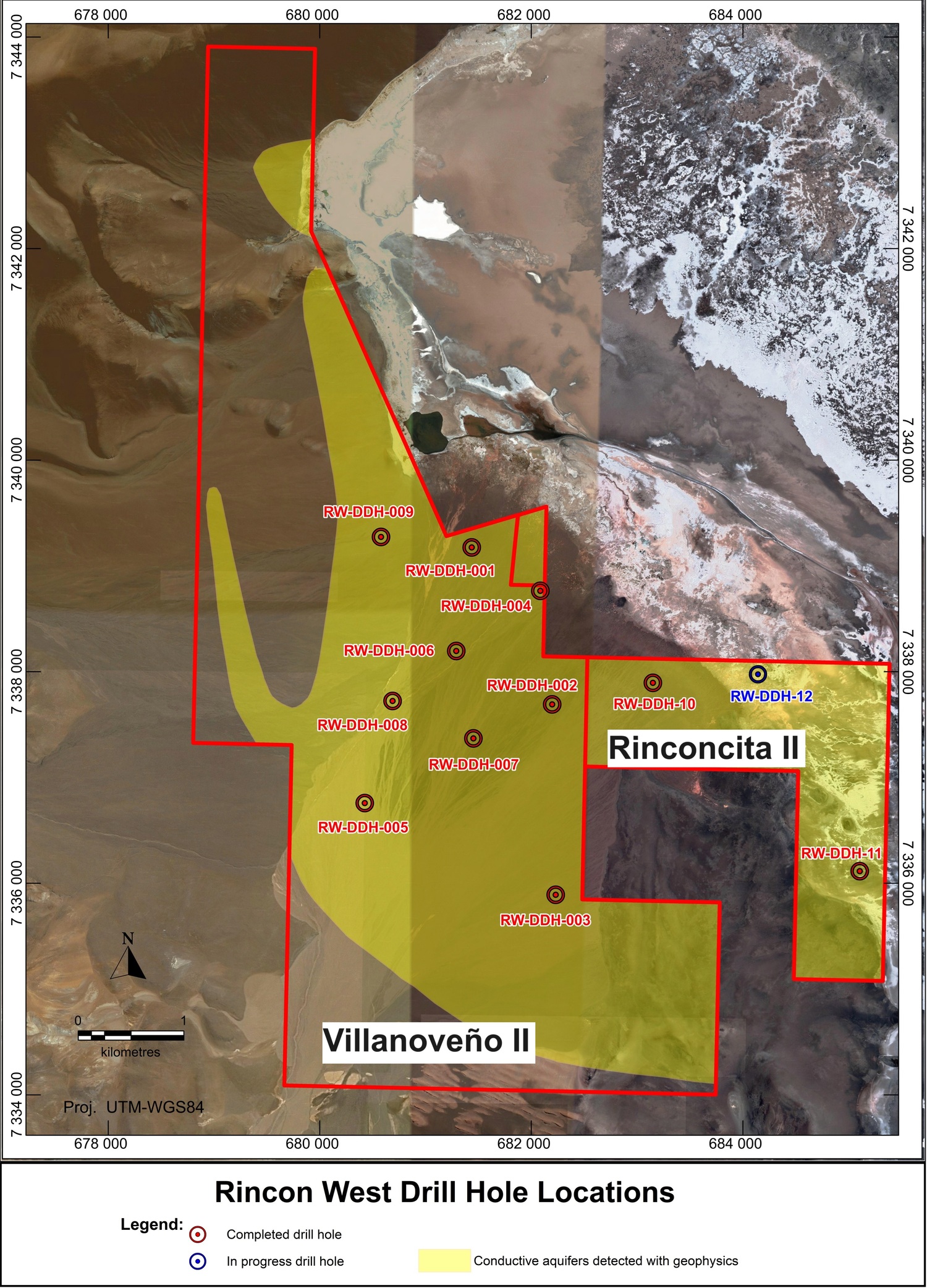 El Proyecto Rincón Oeste cubre 5198,8 hectáreas de la cuenca salar, que consta de tres bloques de propiedades adyacentes al Proyecto Rincón de Rio Tinto. Los pozos de perforación RW-DDH-010 y RW-DDH-011 representan los dos primeros pozos del programa de 6 pozos planificados para la propiedad Rinconcita II, anunciado en el comunicado de prensa de la Compañía del 19 de octubre de 2023 . La propiedad Rinconcita II representa una extensión continua de la cuenca arenosa occidental en Rincón Oeste, hacia el este sobre el salar de Rincón.