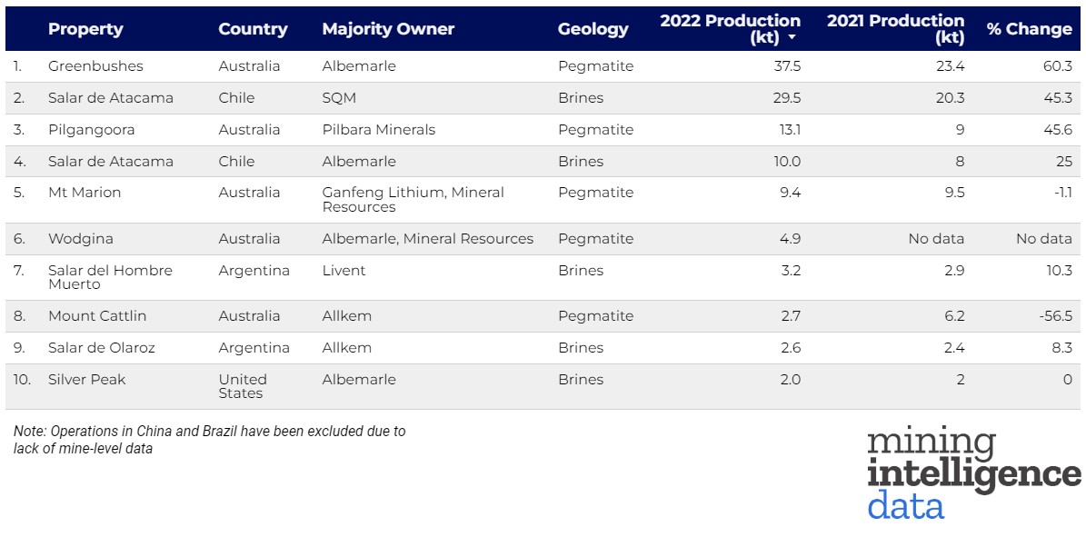 Destacando las minas de litio de mayor producción en el mundo, que cubren una cantidad significativa de la producción mundial de litio, los datos de Mining Intelligence  proporcionan una clasificación de las operaciones más grandes, según el litio en concentrado producido en 2022 y medido en kilotoneladas.