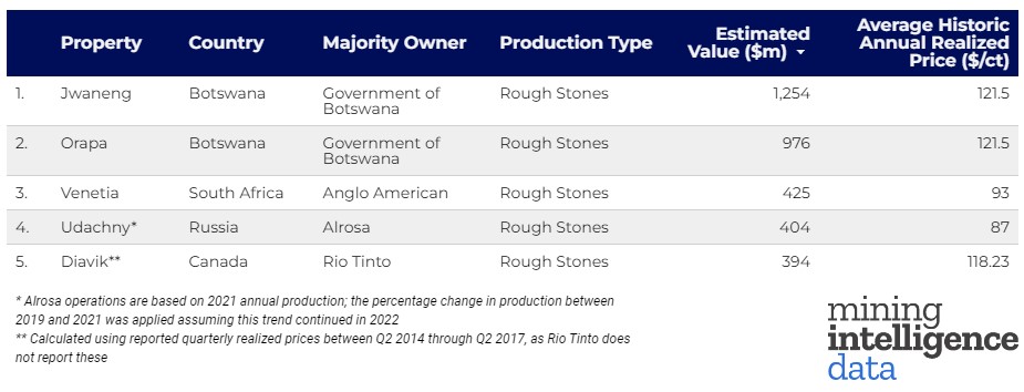 La mina canadiense Diavik, propiedad de Rio Tinto, aparece como la número 5 en términos de valor, estimada en $ 394 millones y con un precio promedio histórico anualizado de $ 118,2 por quilate.