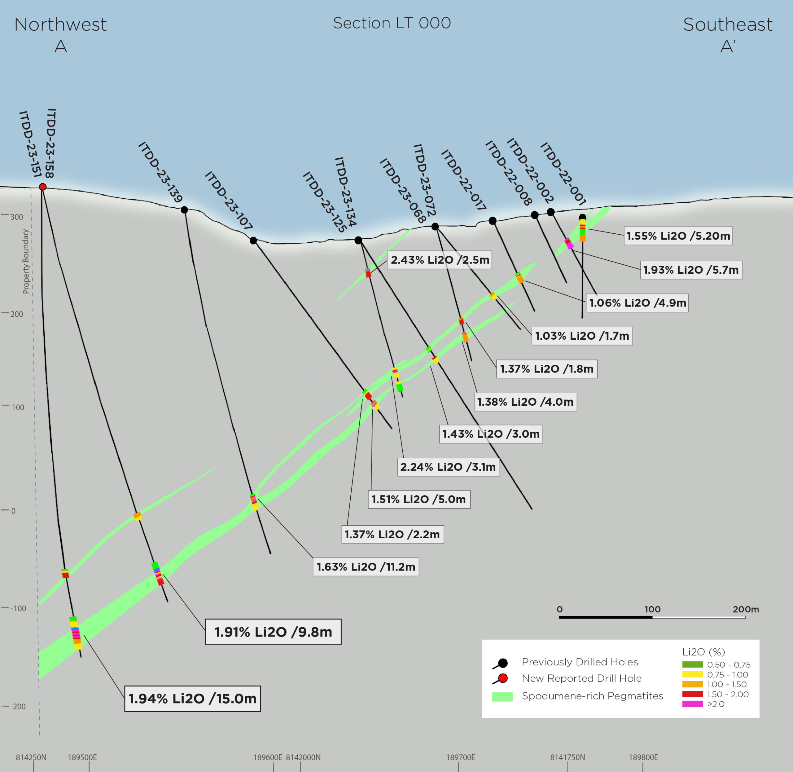 • 1,94 % Li2O en 15,0 m (pozo ITDD-23-158; consulte la Figura 2)