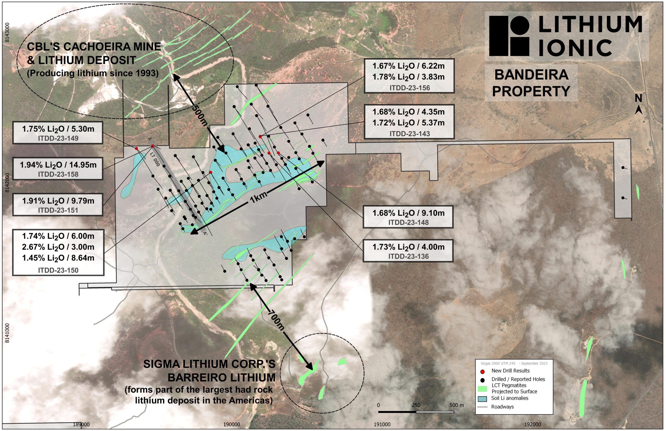Blake Hylands, P.Geo., director ejecutivo de Lithium Ionic, comentó: “Nuestro programa de perforación de expansión y relleno en Bandeira continúa arrojando resultados positivos. Estamos particularmente impresionados con los resultados de alta ley de los pozos ITDD-23-158 e ITDD-23-151 de 1,94% Li2O en 15,0 m y 1,91% Li2O en 9,8 m, lo que confirmó una extensión de 250 m de profundidad de un pozo grande y cada vez más amplio. pegmatita que se extiende a más de 800 metros de la superficie, alcanzando una profundidad de 450 metros”.