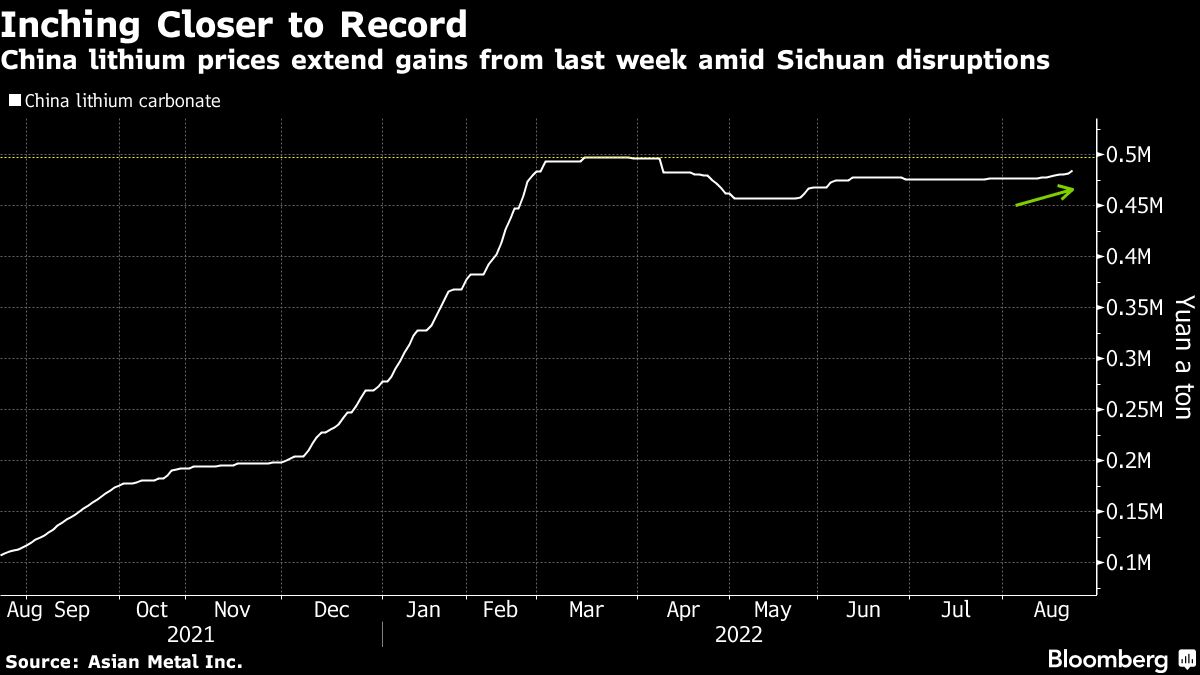 Sichuan, hogar de más de una quinta parte de la producción de litio de China, extendió los cortes de energía industrial esta semana en medio de la ola de calor más intensa en más de medio siglo. Las interrupciones en el suministro en la provincia agregarán combustible al impresionante repunte del metal de batería en el último año, y los precios del carbonato de litio alcanzaron el lunes el nivel más alto desde abril a 484.500 yuanes ($ 70.610) por tonelada.