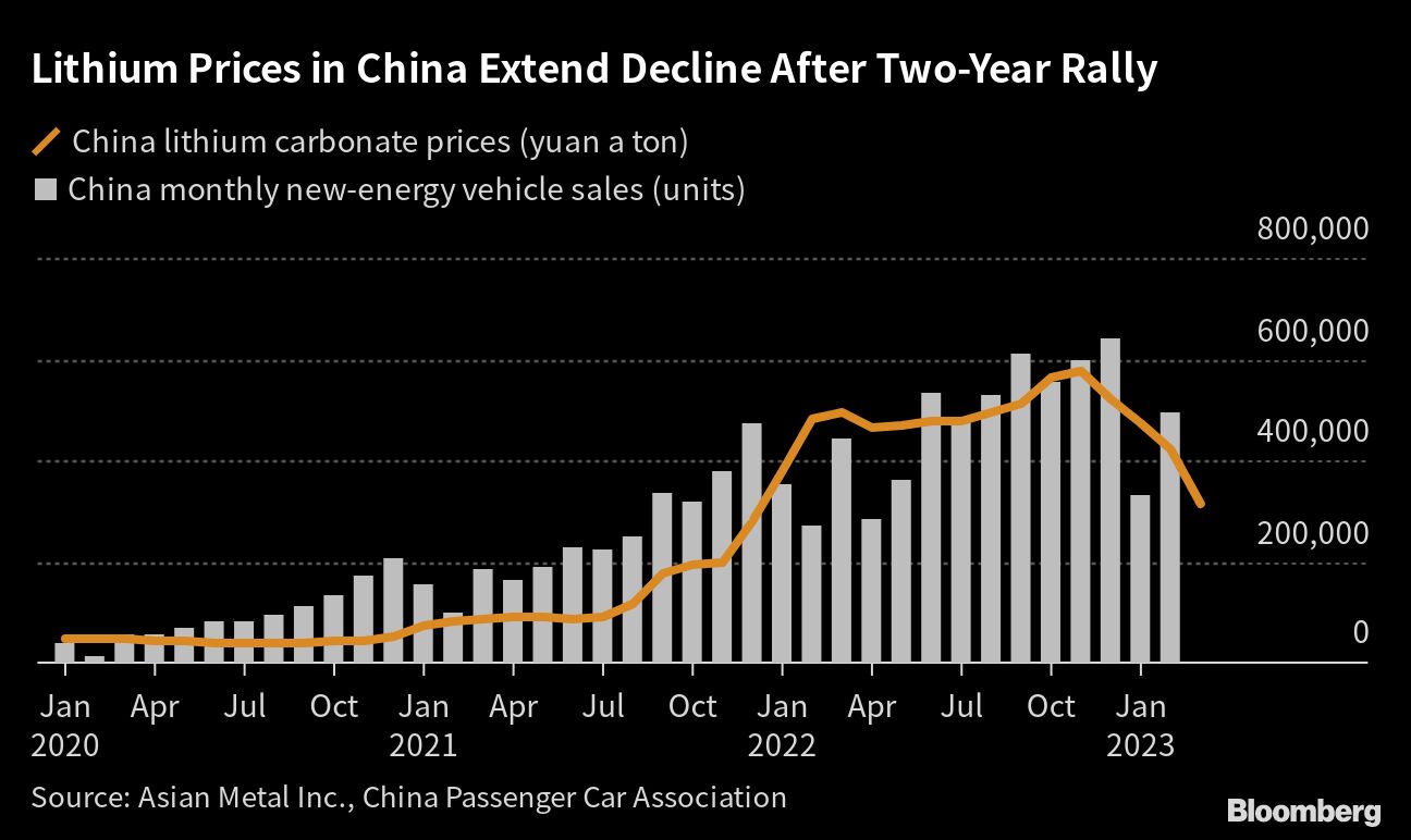 Los precios del carbonato de litio, el producto de referencia, se han reducido a la mitad desde que se disparó a un récord en noviembre pasado, según datos de Asian Metal Inc. Eso refleja dos presiones principales: la perspectiva de que haya mucho más suministro global en línea este año, y señales de que el vertiginoso El crecimiento del sector de vehículos eléctricos de China está comenzando a moderarse.