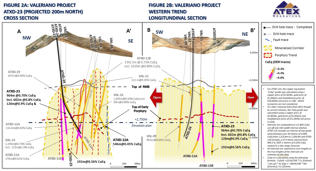 ATEX Resources Inc. (TSXV: ATX) (» ATEX » o la » Compañía «) se complace en anunciar los resultados completos del ensayo para perforaciones ATXD-22A y ATXD -23 de su campaña de perforación Fase III en el Proyecto de Cobre-Oro Valeriano (» Valeriano » o el » Proyecto «) ubicado en la Región de Atacama, Chile.