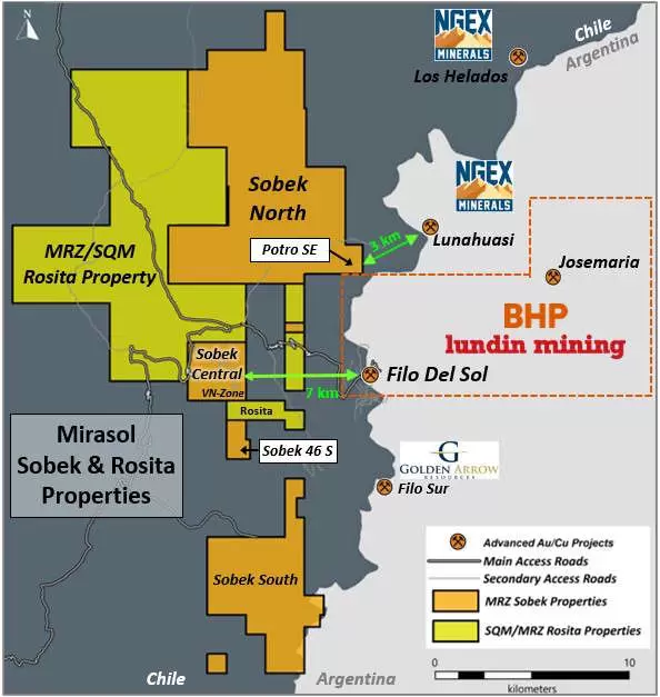 Mirasol apostó por el Proyecto Sobek en 2016 con base en la geología local prospectiva y la atractiva arquitectura estructural antes del descubrimiento en 2021 de la zona de alimentación de alta ley en el depósito de oro y cobre Filo del Sol y el descubrimiento de Lunahuasi en 2023. El Proyecto Sobek, en continua expansión y consolidación, está ubicado en el mismo corredor estructural regional de N-S y a solo 3 km al oeste del depósito Filo del Sol y a 3 km al suroeste del descubrimiento de NGEx Mineral en Lunahuasi.