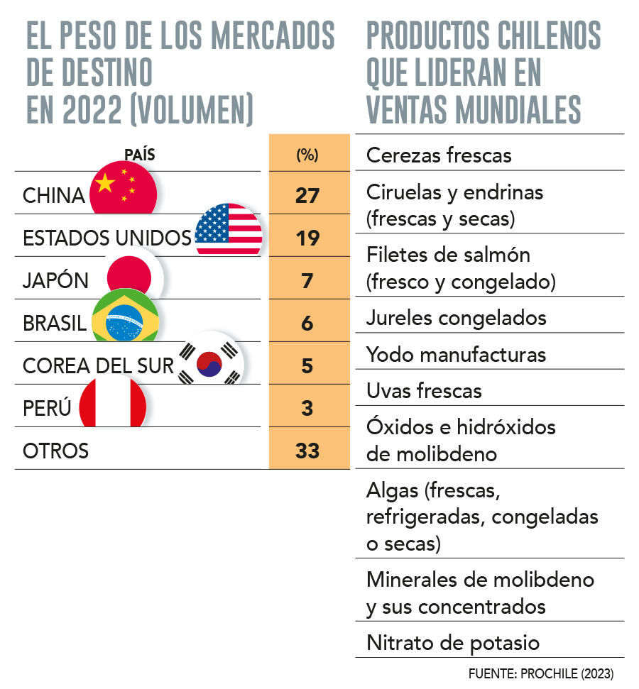 Los productos más exportados fueron salmones, celulosa, cerezas frescas, molibdeno, yodo, productos de hierro y acero, abonos de origen animal o vegetal y uvas frescas.