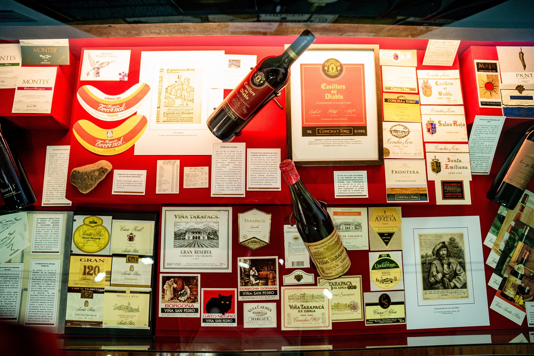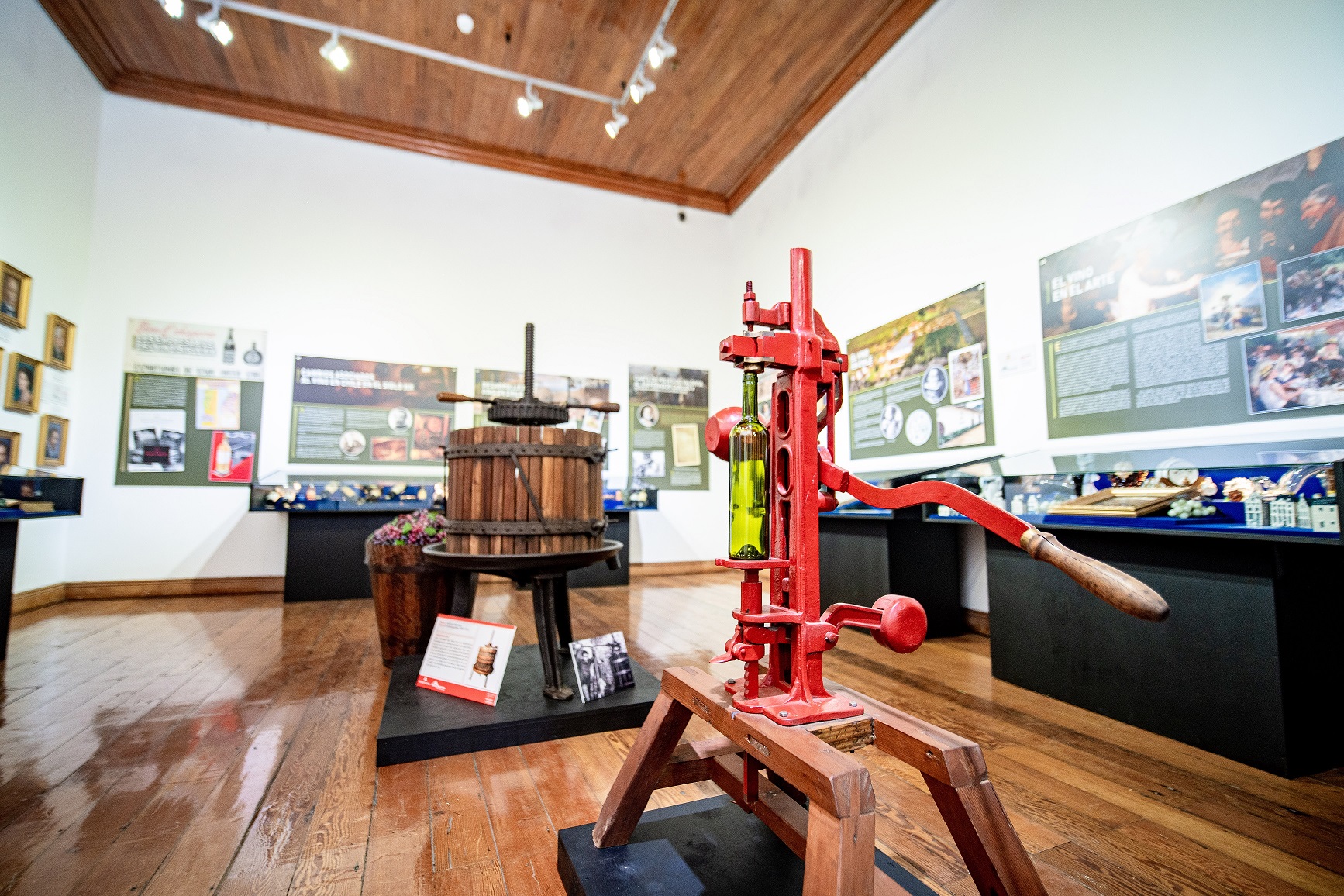 La exposición da cuenta del protagonismo del vino en diferentes ámbitos en la historia de la humanidad, proponiendo un interesante recorrido en el tiempo a través de una colección de piezas gráficas, que describen aspectos sobre su evolución, cultivo, técnicas de producción, elaboración y consumo; además de vitrinas con utensilios, copas, botellas, vasijas, registros fotográficos y artefactos.