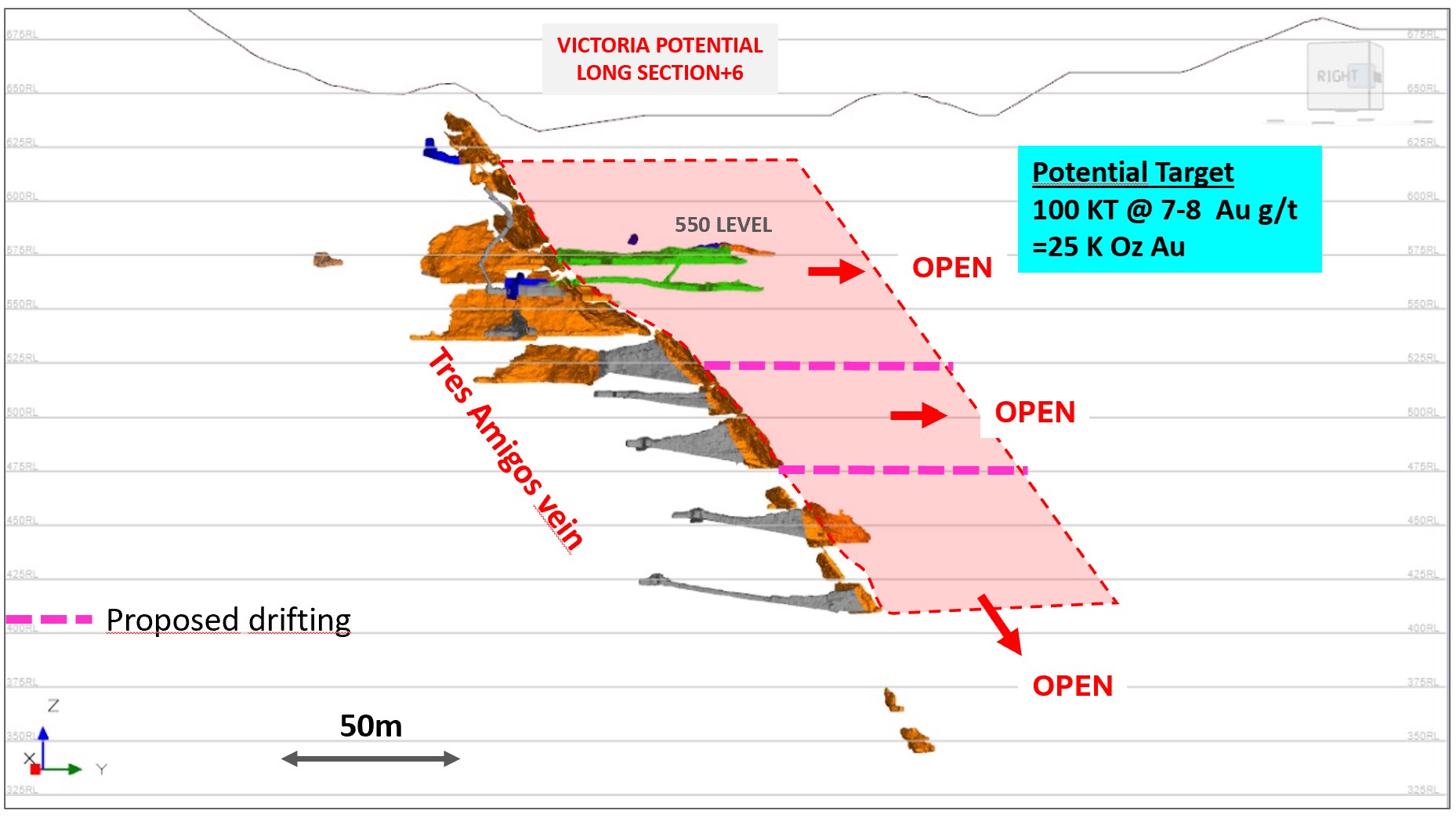 El análisis geológico y estructural en el depósito Tres Amigos ha llevado a la identificación de un objetivo de exploración en el muro colgante previamente inexplorado del sistema de vetas Tres Amigos. El desarrollo posterior hacia este objetivo ha resultado en el descubrimiento de una veta mineralizada previamente no documentada de aproximadamente 1,5 metros de ancho (ver Figura 2). Hasta la fecha, se han completado un total de 110 metros de deriva en dos subniveles (550 y 540 niveles, espaciados 10 metros), junto con la recolección y análisis de 1.069 muestras de canales. Además, la Compañía ha extraído y procesado una muestra a granel de aproximadamente 10.000 toneladas que son susceptibles de recuperación en la planta de flotación existente, con resultados de ensayos internos que indican una ley promedio estimada de 8 gramos por tonelada de oro. Con base en el trabajo de exploración actual, se considera que la veta Victoria tiene un objetivo de exploración conceptual de aproximadamente 100,000 toneladas con una ley de entre 7 y 8 gramos por tonelada de oro, lo que representa un potencial de ~ 25,000 onzas de oro contenido.