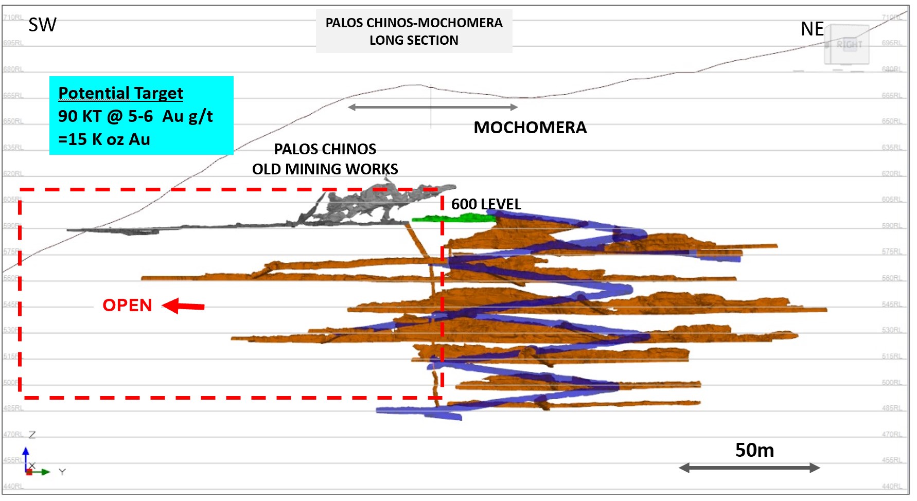La exploración que se desplaza hacia el histórico sistema de vetas Palos Chinos ha avanzado a aproximadamente 70 metros de los trabajos actuales de la mina. Las observaciones de este desarrollo, combinadas con el mapeo histórico de 1999-2000, sugieren un segundo objetivo de exploración cerca de la infraestructura. La evaluación preliminar indica un objetivo conceptual de exploración de aproximadamente 90.000 toneladas con una ley de 5 a 6 g/t por tonelada de oro, lo que representa un potencial de ~15.000 onzas de oro contenido.