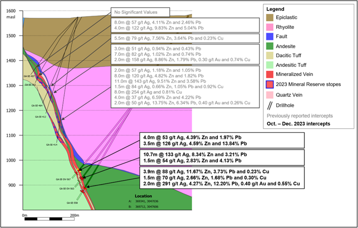 - 5,1 m (4,0 m ETW) con 103 g/t Ag, 16,49 % Zn, 7,01 % Pb, 0,14 g/t Au y 0,21 % Cu (SE-559)
