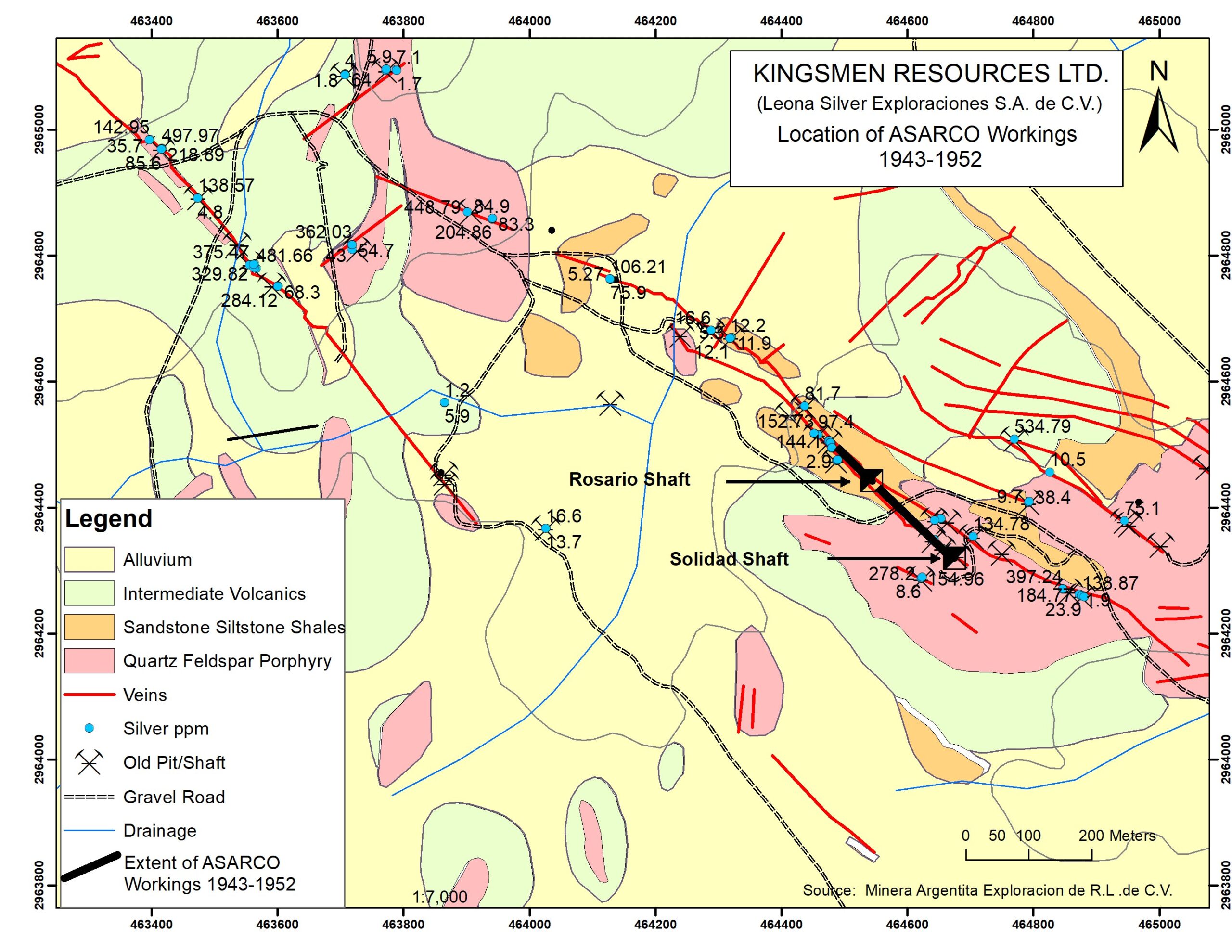 Kingsmen ha identificado la extensión de los antiguos trabajos de ASARCO (1943 a 1952) en el sistema de vetas Solidad de 1,7 km de largo (Figura 1). Los trabajos están ubicados en el extremo sur del sistema de vetas Solidad y se limitaron al área que se muestra en la Figura 1. Los trabajos se extienden a más de 250 metros a lo largo del rumbo y hasta una profundidad vertical de aproximadamente 125 metros en cuatro niveles. Los trabajos no se extendían por debajo del nivel freático. Toda la producción se envió a las instalaciones mineras de ASARCO en Parral, donde ASARCO operaba las minas La Prieta, Veta Colorada, Palmilla y Santa Bárbara. Se informa que las leyes diluidas mineras promedio fueron del orden de 0,6 a 0,8 g/t de oro, de 300 a 518 g/t de plata, de 6,2 a 10,9 % de plomo y de 6,5 a 10,3 % de zinc, de cuatro vetas diferentes, llamadas La Soledad, Santo Niño, Eva y Rosario.